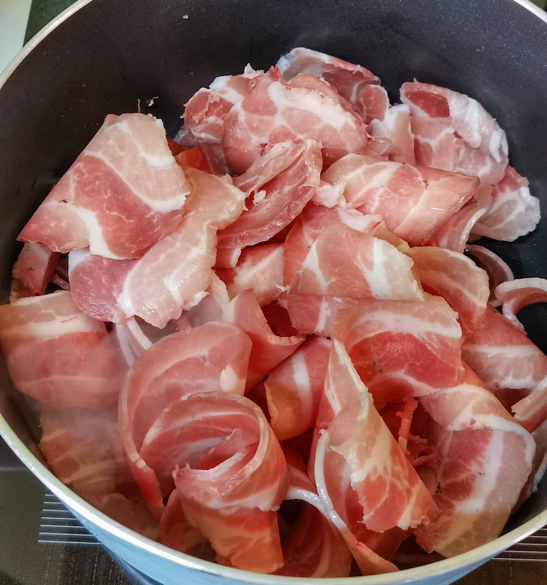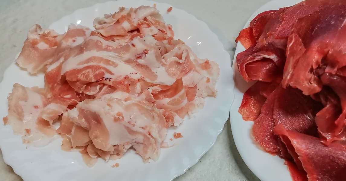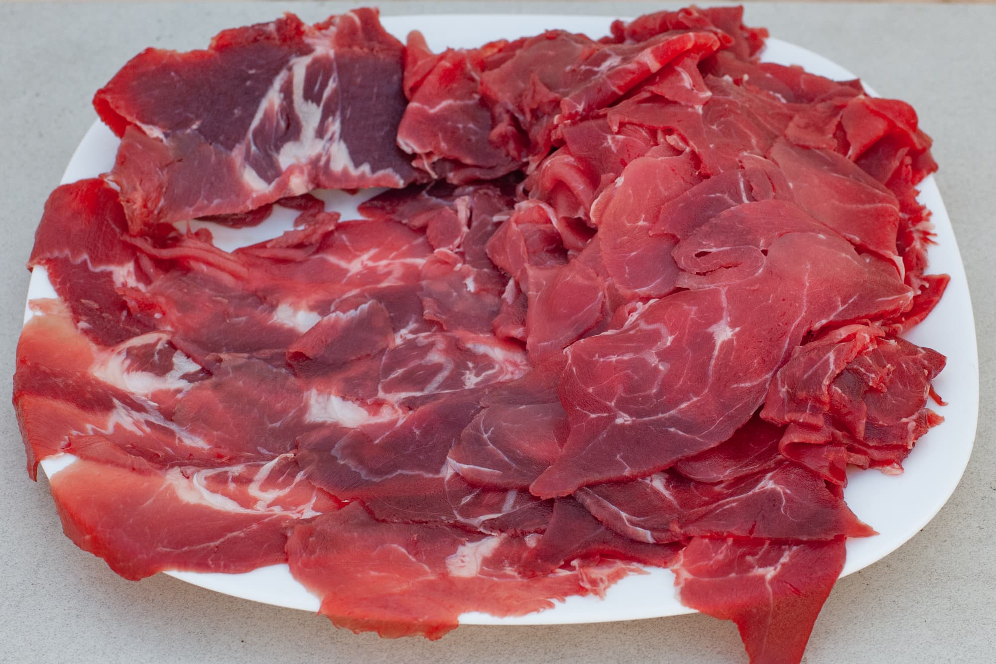 Мы взяли свиную грудинку и бедренную говядину. Слегка подморозили в морозилке до состояния, когда мясо еще можно продавить пальцем. Грудинку нарезали слайсами по 1-1,5 мм и по 2-2,5 мм, говядину чуть толще.