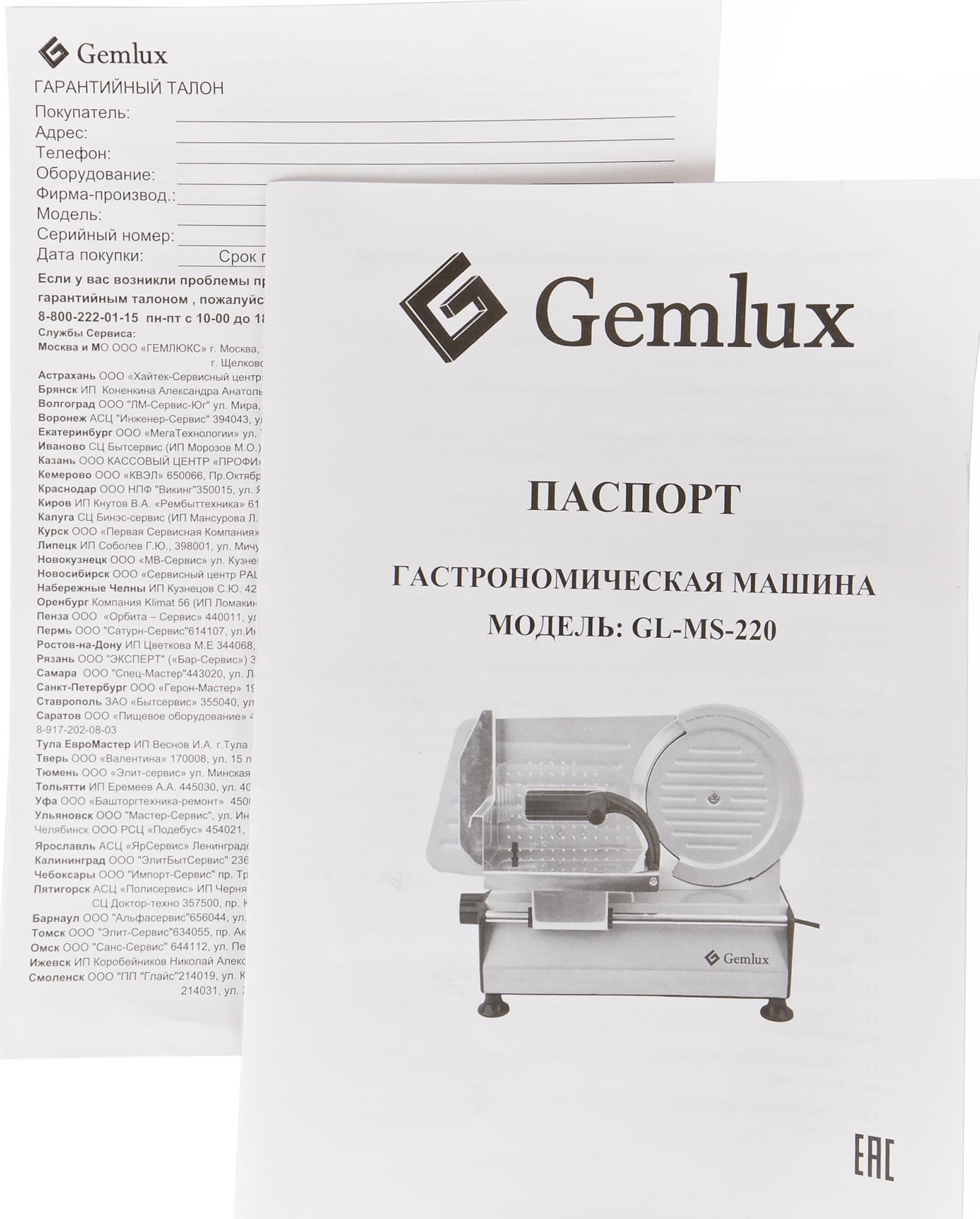 Производитель допускает использовать Gemlux GL-MS-220 только для нарезки мясной гастрономии. Не допускается использовать прибор для нарезания замороженных продуктов, мяса и рыбы с костями и непищевых продуктов.