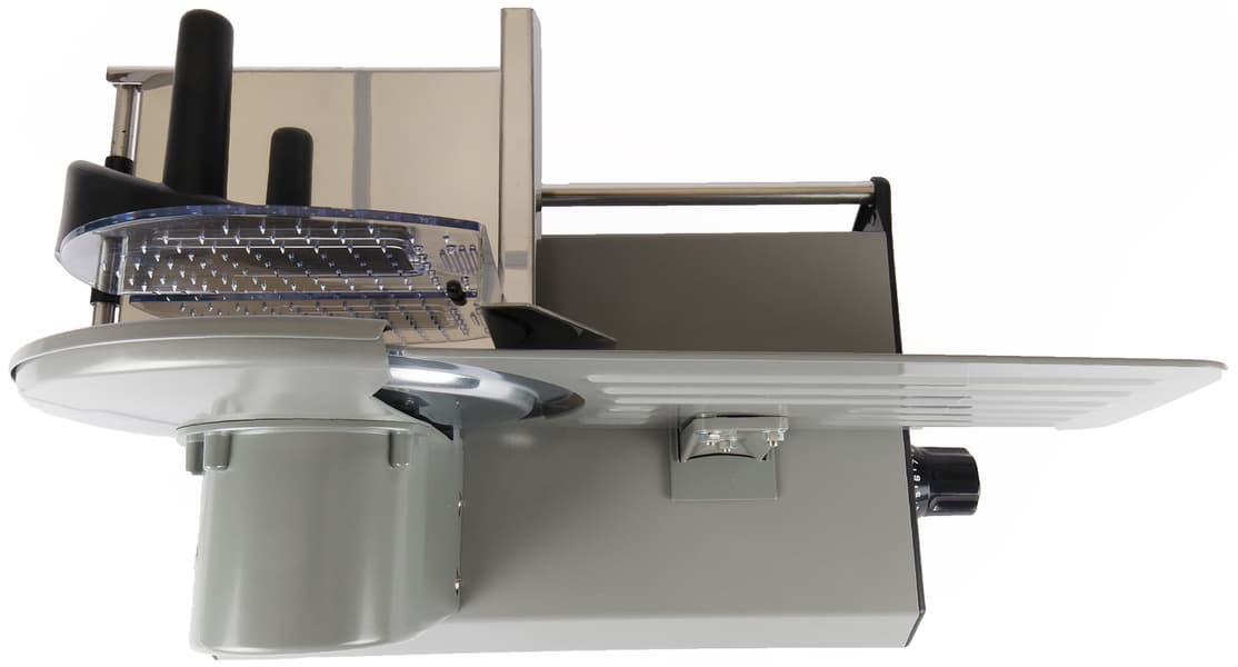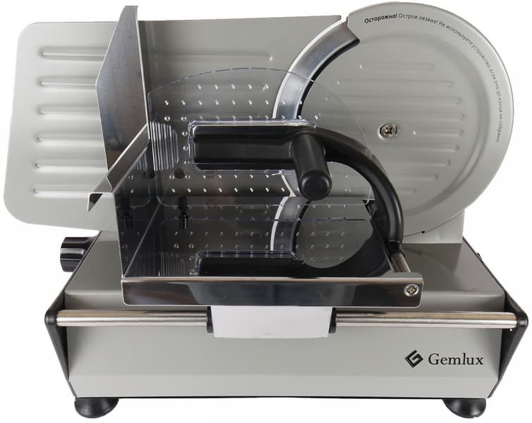 Модель Gemlux GL-MS-220 относится к полуавтоматическому типу гравитационных слайсеров, так как автоматически вращающийся нож расположен не вертикально, а под небольшим углом к поверхности стола. Полуавтоматический тип — потому что каретку с положенным на нее продуктом необходимо двигать вручную. В отличие от младшей модели, у GL-MS-220 есть кожух лезвия и несъемная крышка держателя, она двигается вместе с держателем по направляющей.