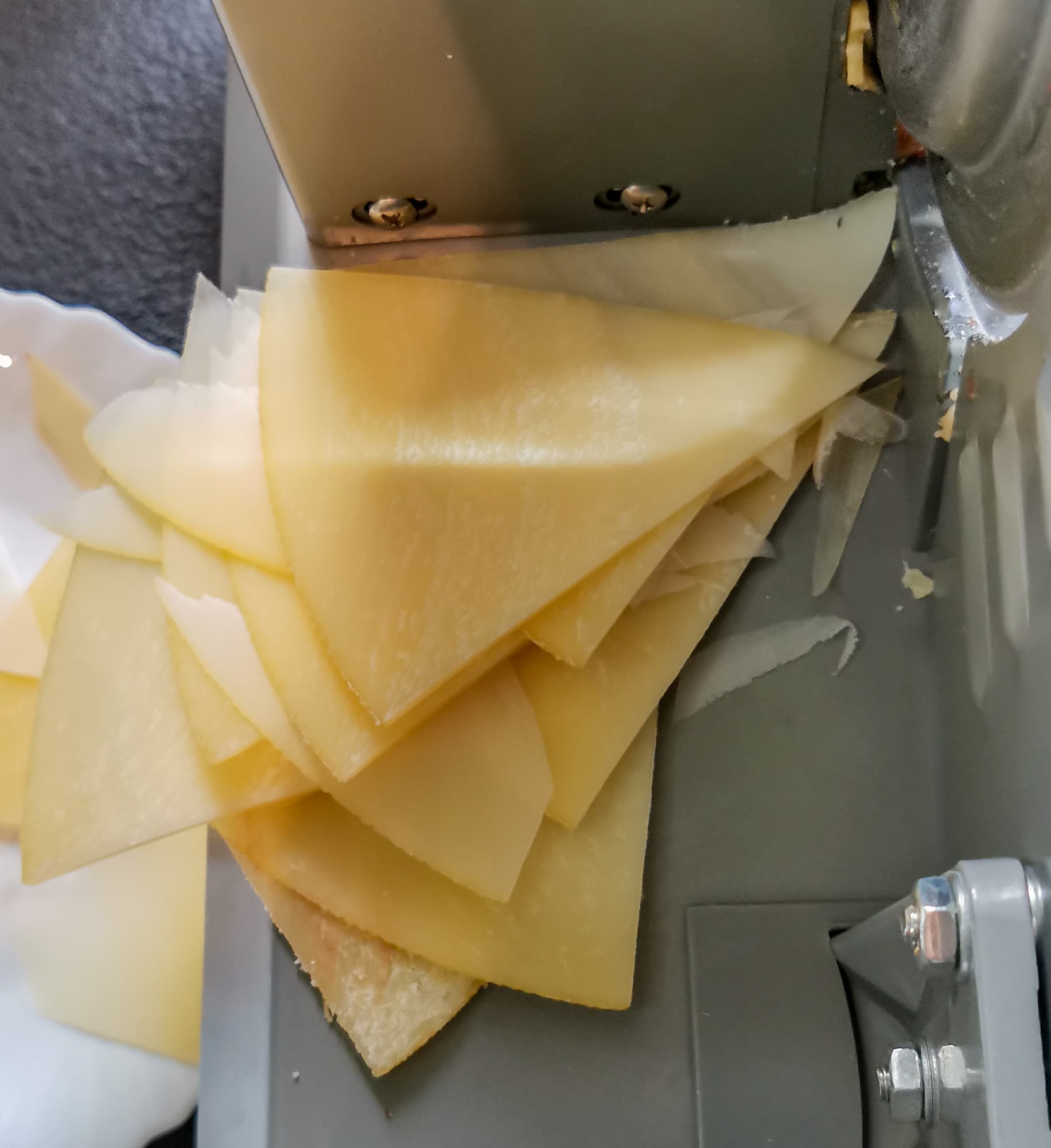 Мы резали твердый пармезан, более мягкий белорусский сыр, заявленный как Пармезан и полутвердый сыр тильзитного типа. Твердый Пармезан нарезается неплохо, но куски нужно брать небольшого диаметра, так как диск начинает тяжело идти ближе к корке, где сыр самый твердый.