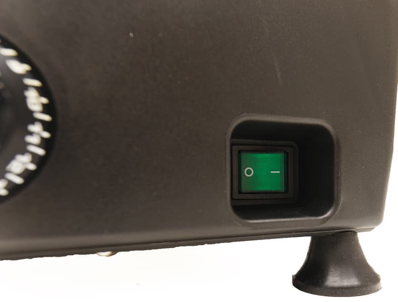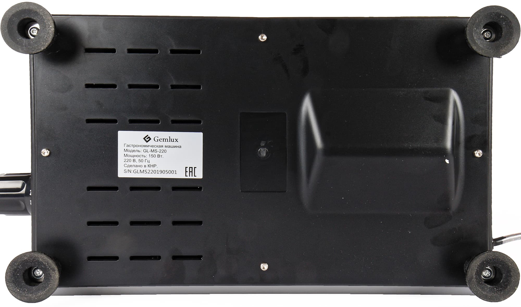 Gemlux GL-MS-220 снабжен четырьмя прорезиненными ножками-присосками, которые дополнительно амортизируют устройство во время работы. Снизу располагается решетка вентилятора и шильда с техническими данными и серийным номером.