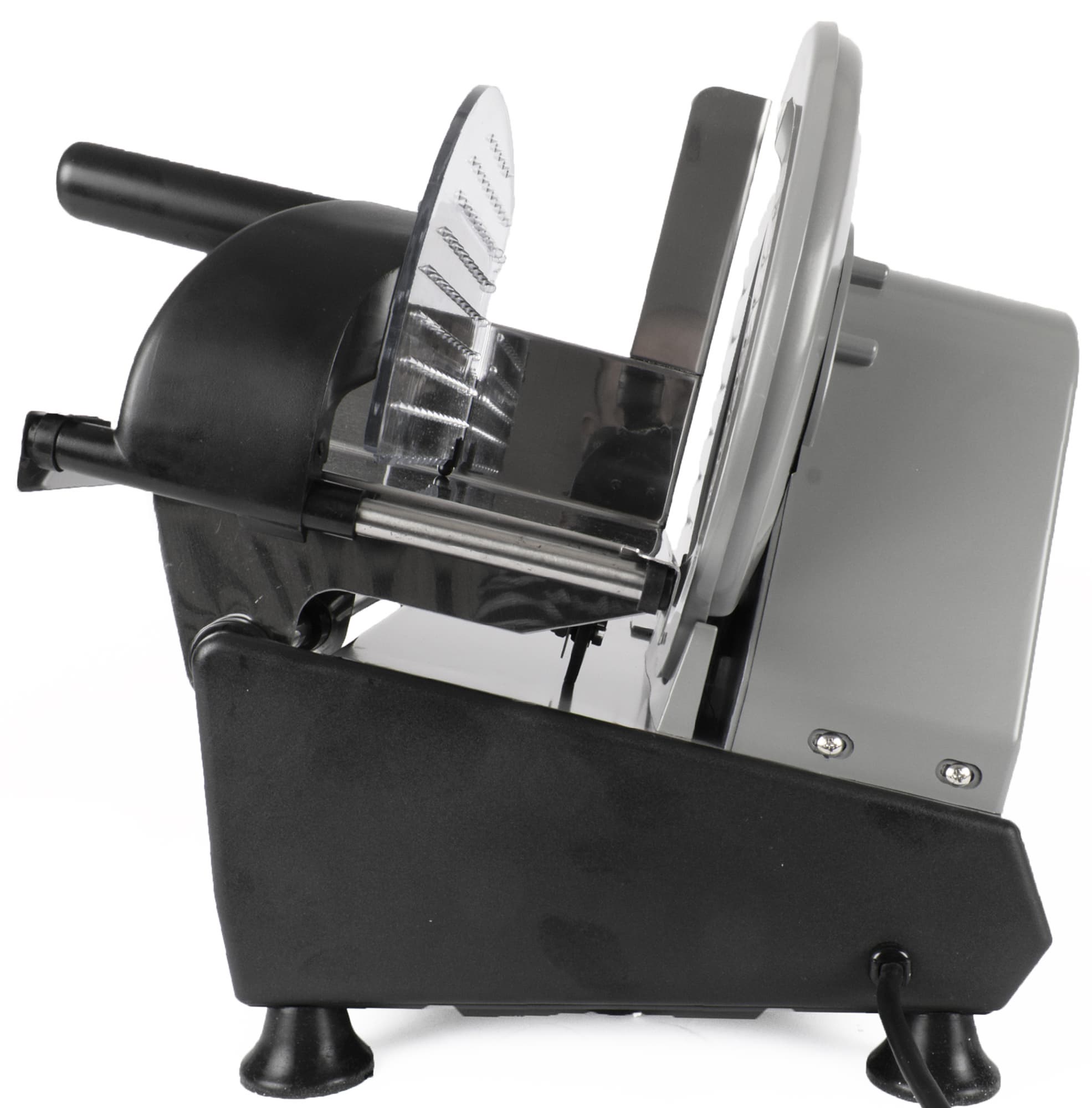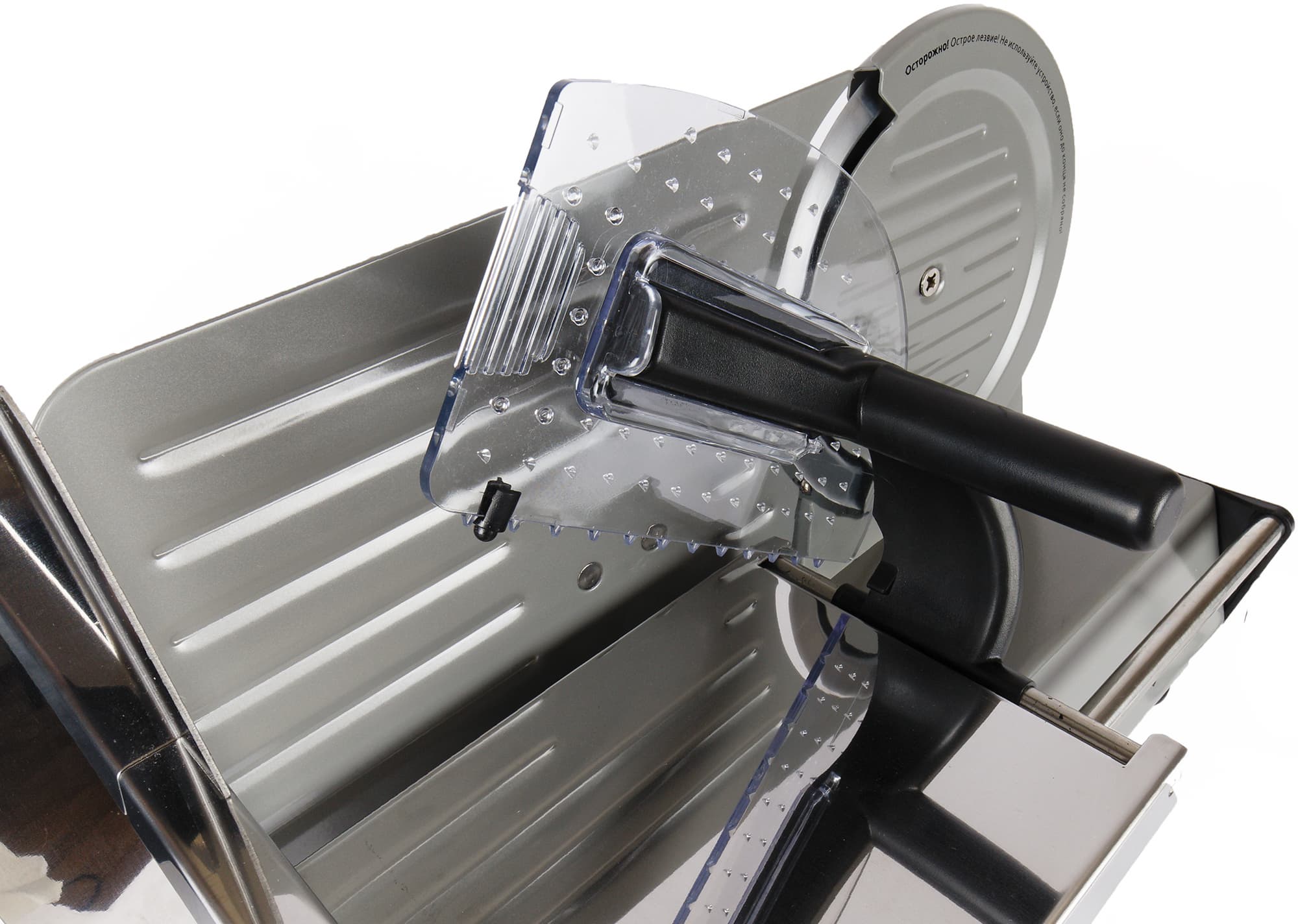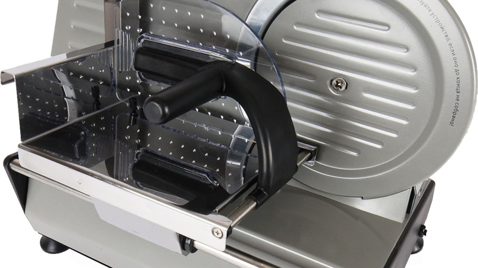 В отличие от Gemlux GL-MS-190, несъемный держатель не позволяет нарезать куски толще 10 см, удерживая их с помощью крышки держателя. Если кусок большой, крышку приходится откидывать вперед и прижимать кусок рукой. Длинные палки колбасы тоже приходится резать, откидывая крышку и подавая их рукой. Мы пробовали резать тонкую палку вареной колбасы, отрезав от нее 10 см, но система держателя не смогла ее фиксировать — колбаса не удерживается на крышке шипами, переворачивается или вообще остается после прогона прилипшей к кожуху диска. Можно сказать, что нарезка вареной колбасы небольшого диаметра — не самая сильная сторона этого прибора.