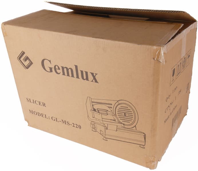 Гастрономическая машина Gemlux GL-MS-220 прибыла на тесты в обычной коробке из технического картона, надежно зафиксированная внутри пенопластовыми вставками. На коробке схематичное изображение устройства, его основные характеристики и служебные пиктограммы. Ручками для переноски коробка не оборудована.