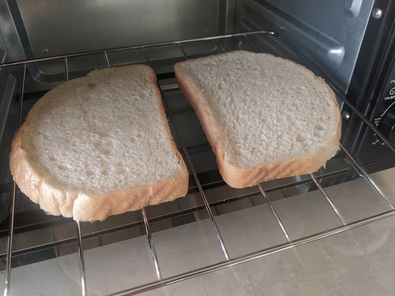 Знакомство с духовкой мы начали с простого поджаренного хлеба — это помогло оценить равномерность нагрева духового шкафа и распределение температуры в нем. Ломтики белого тостового хлеба мы поместили в духовой шкаф на среднюю решетку и включили максимальный нагрев.