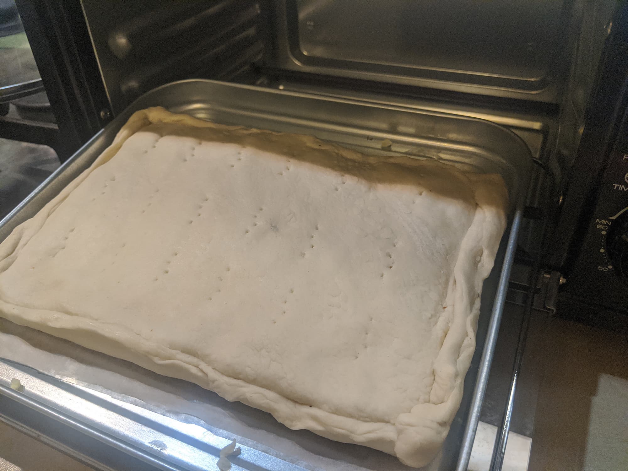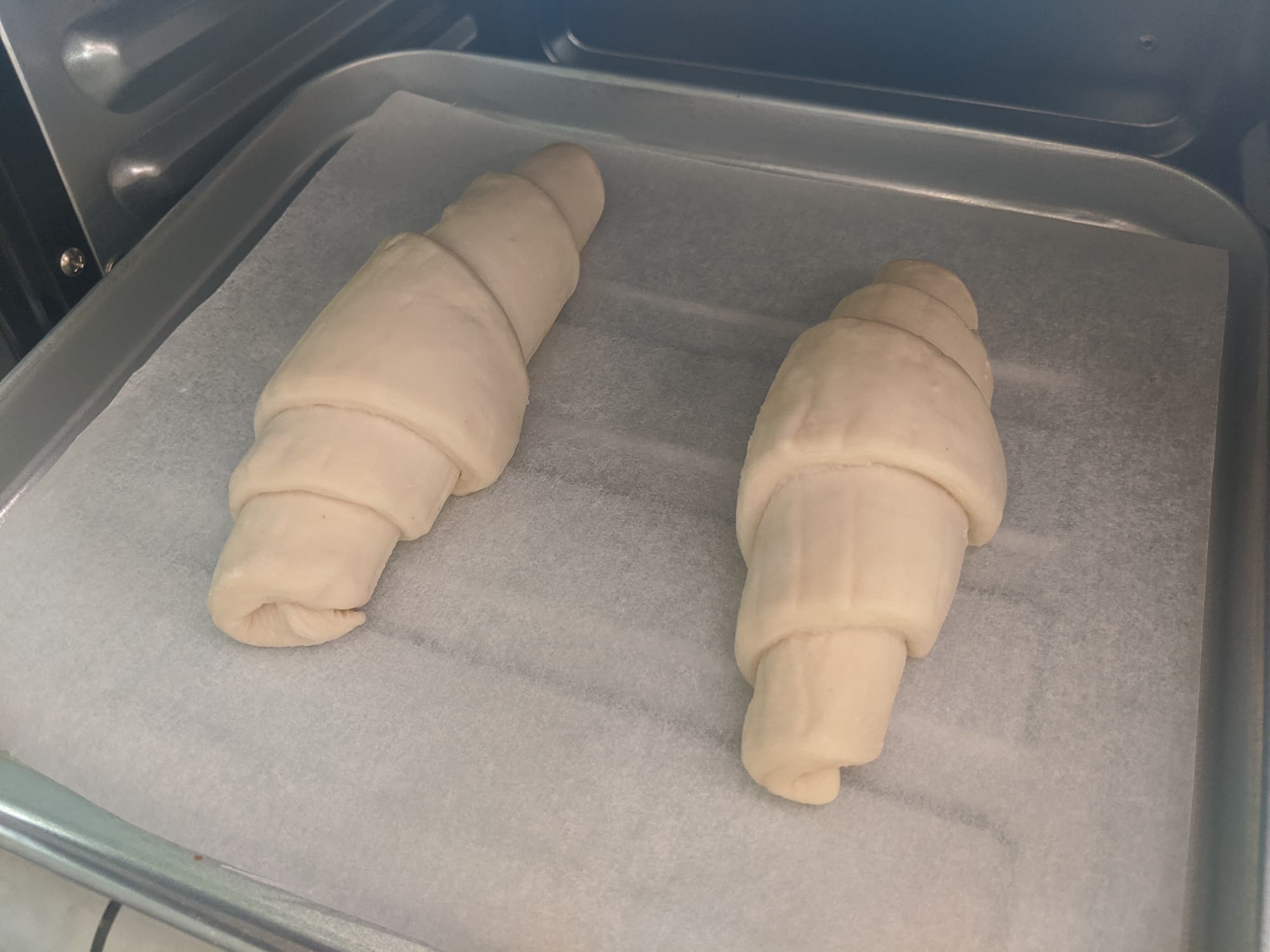 Алюминиевый поддон мы застелили пергаментом и поместили на него круассаны, предварительно размороженные в течение 20 минут. Выпекать слоеные рогалики рекомендуется при температуре 200-210 °C, но помня о том, что термостат духового шкафа несколько завышает фактическую температуру приготовления, мы установили его на 180 °C.