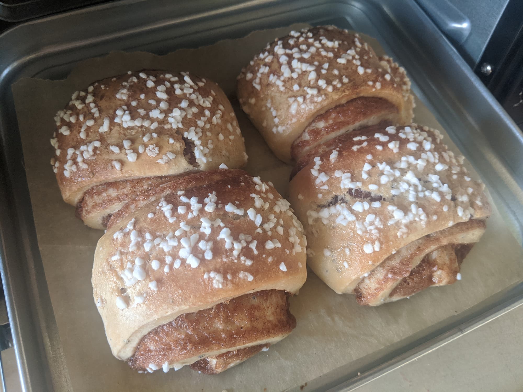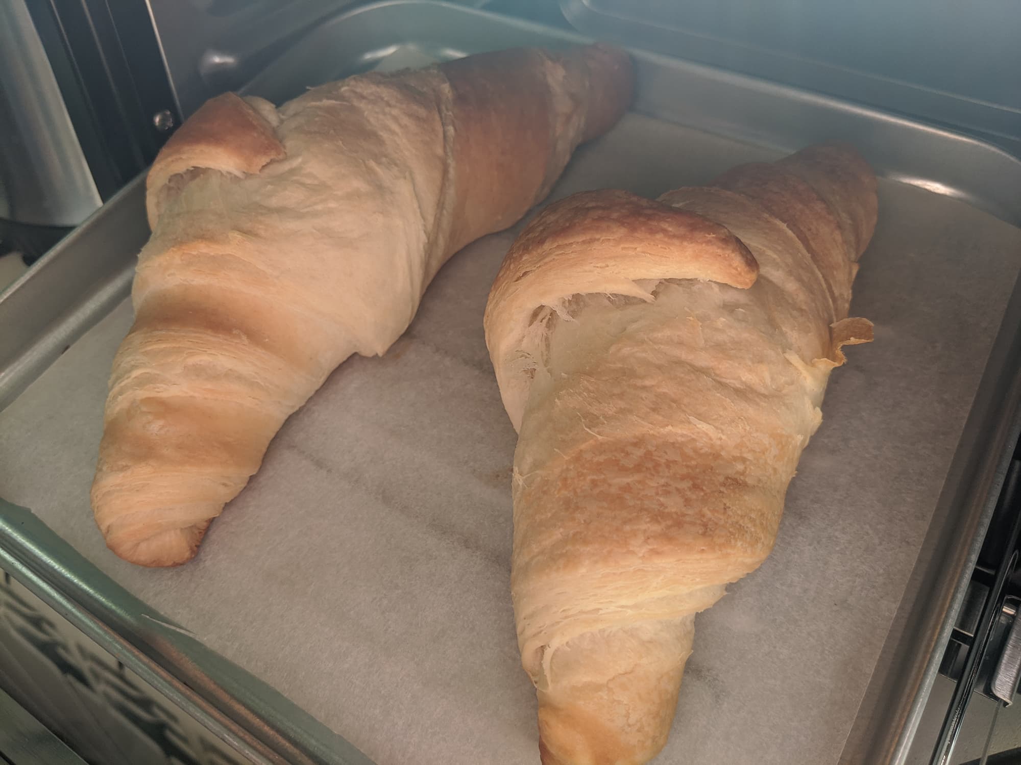 Результат оказался превосходен. Через 15 минут мы вынули из печки хорошо выпеченные, но не пересушенные круассаны, а размера поддона оказалось вполне достаточно для двух изделий.