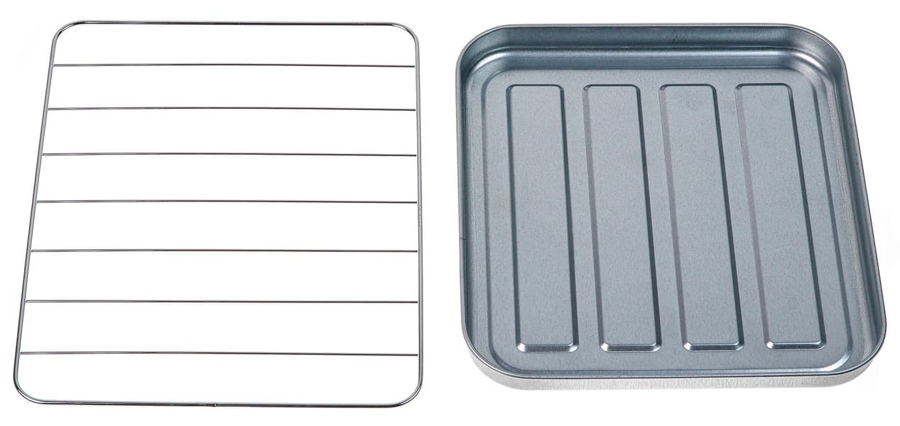Решетка сделана из нержавеющей стали, а форма — из алюминия. Форма меньше размером, чем внутренняя площадь духовки, поэтому установить ее можно только на решетке. Противень в комплект не входит.