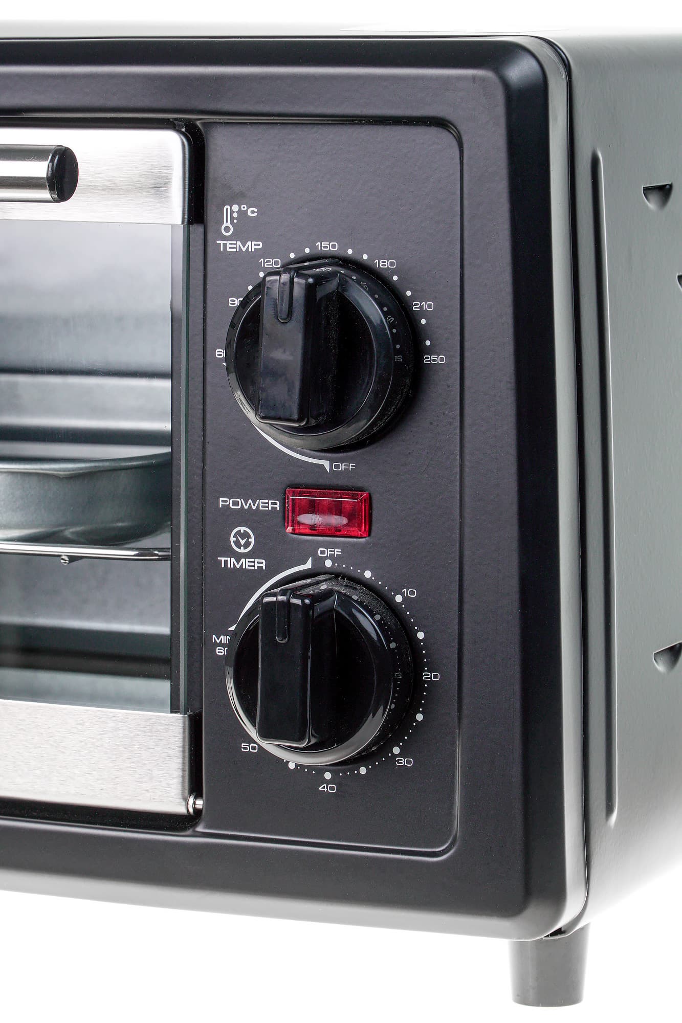 Также на передней стенке расположены два круглых переключателя из черного пластика с нанесенной вокруг них шкалой. Это регулятор температуры с пронумерованными позициями от 60 до 250 градусов и механический таймер от 0 до 60 минут.