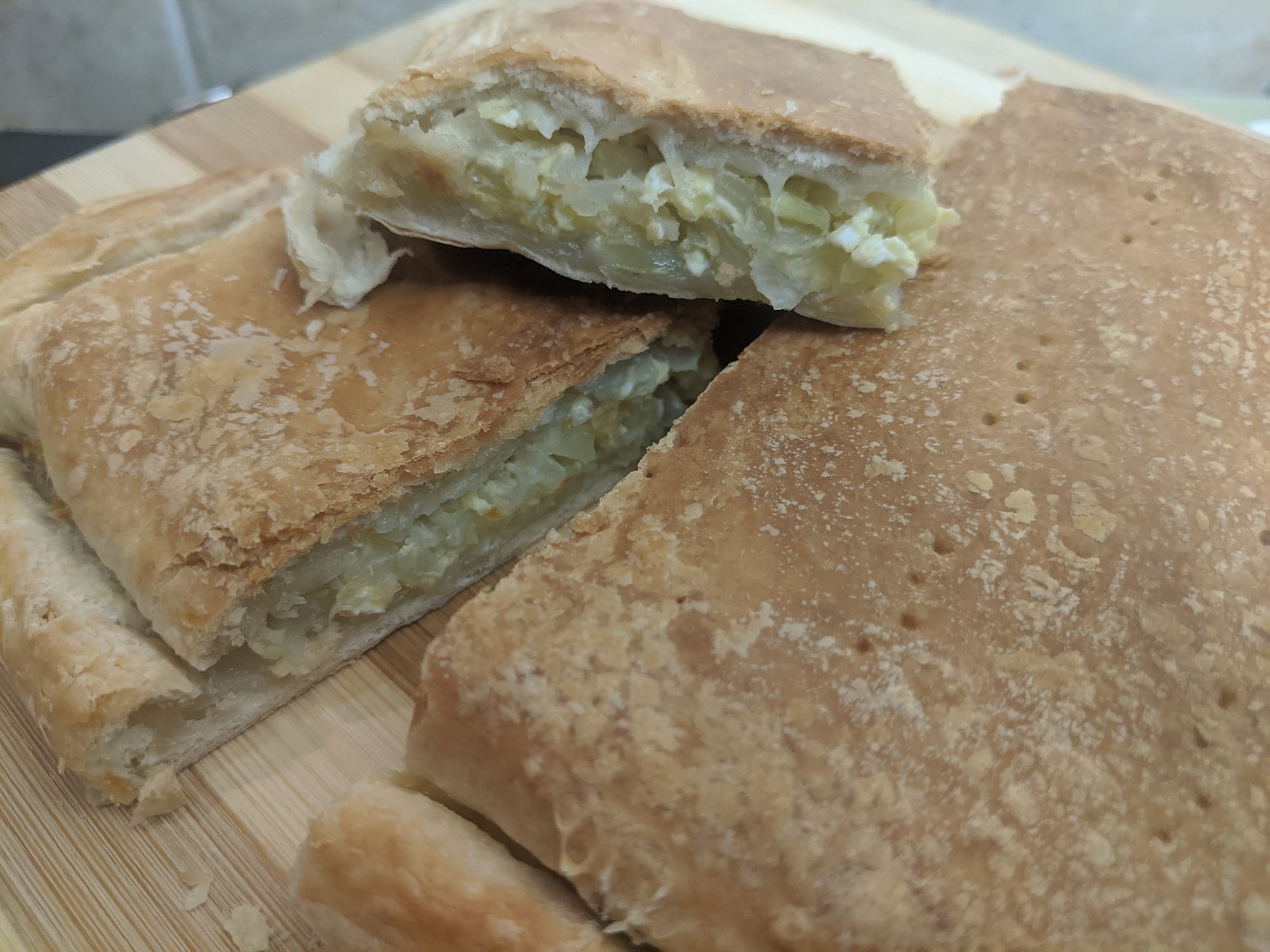Слоеное дрожжевое тесто пропеклось отлично, а поверхность пирога подрумянилась равномерно по всей площади.