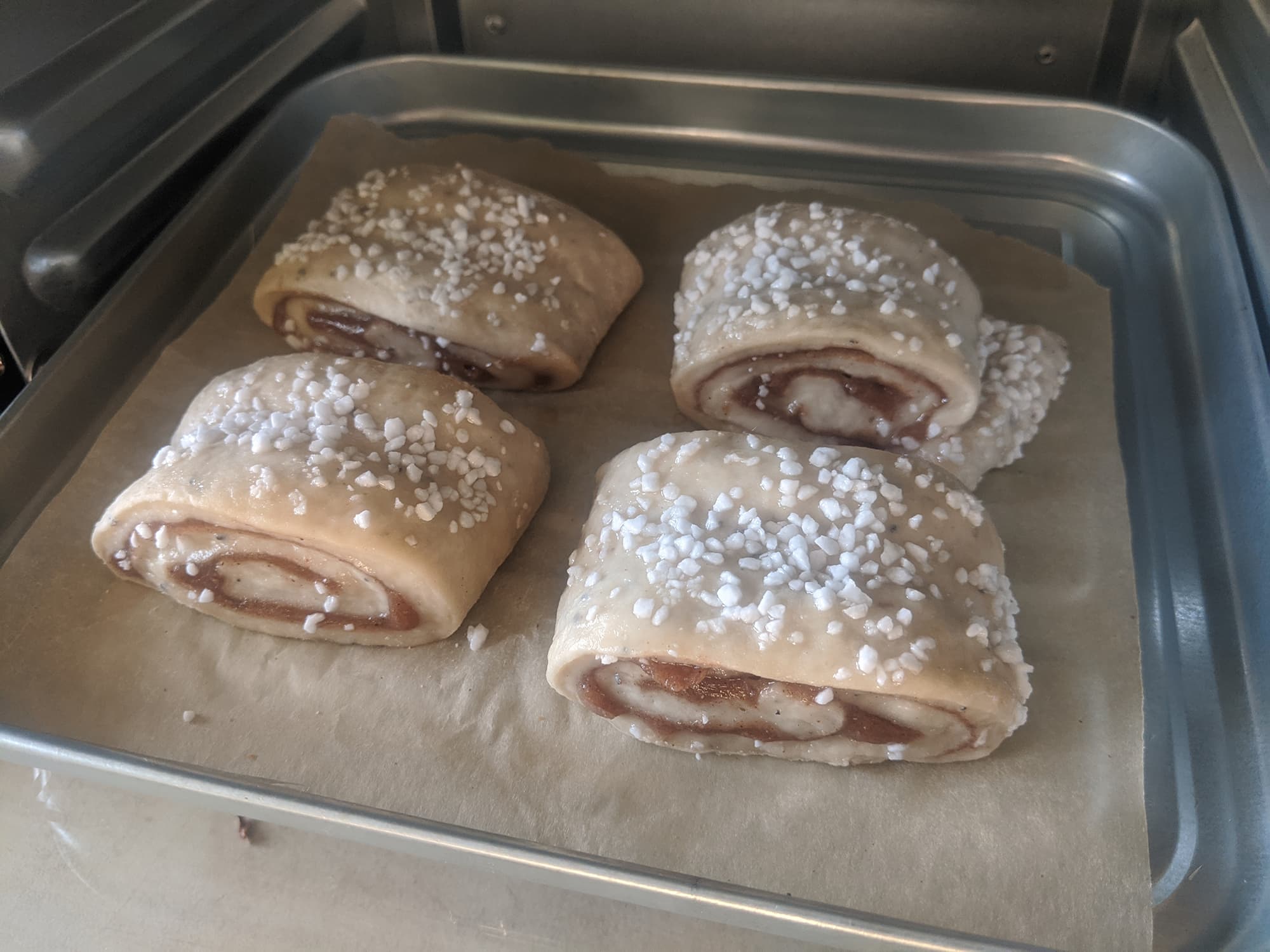 Разморозив булочки, мы разместили их в форме, застеленной пергаментом, на решетке, которую установили в среднем положении и выпекали в течение 20 минут при тех же 180 °C.
