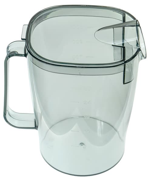 Прозрачный кувшин из затемненного пластика оснащен рисками: в миллилитрах (шаг 200 мл начиная с отметки 300 мл) и в унциях (с шагом 5 начиная с 9). Вместе с крышкой носик образует раструб — в него вставляется краник, из которого вытекает сок.