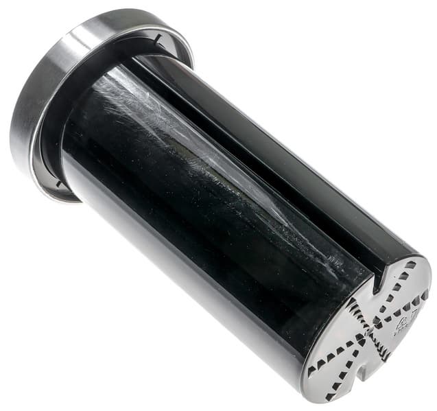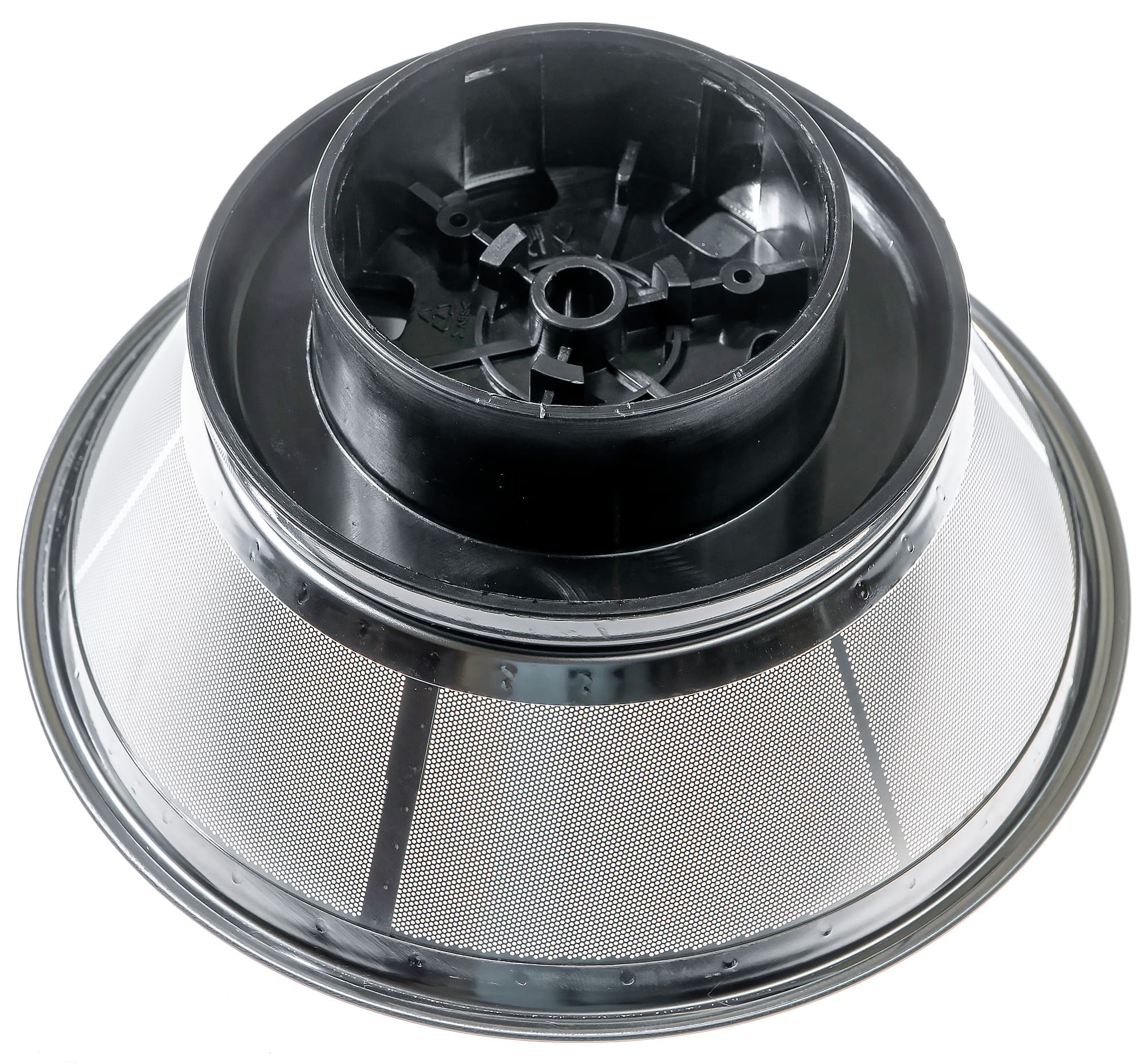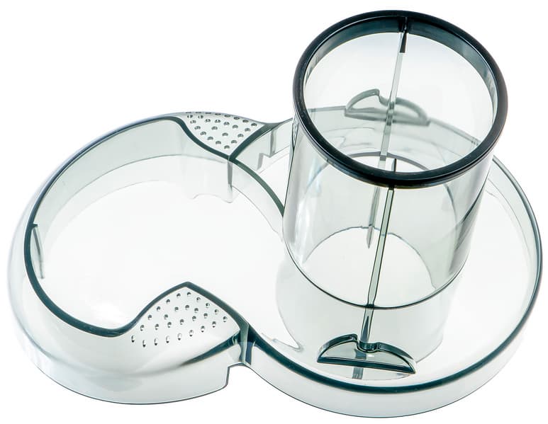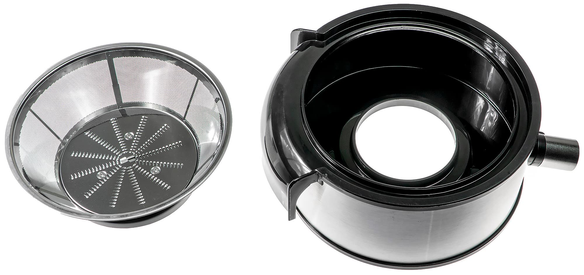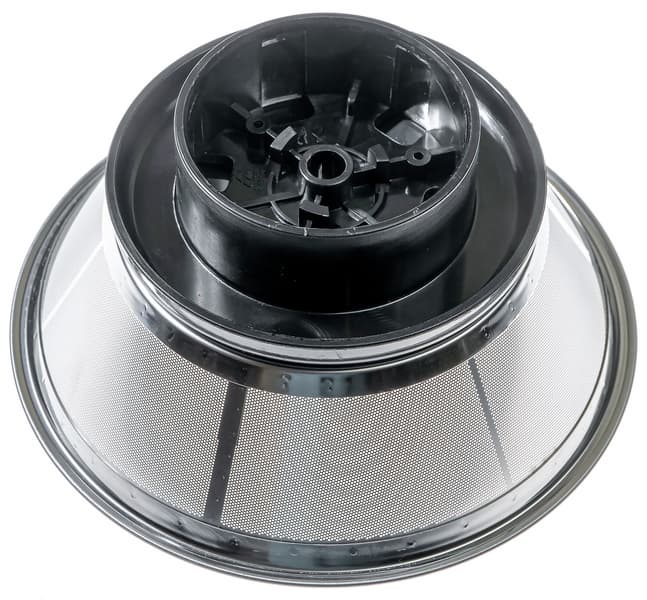 Собирается прибор по принципу детской пирамидки: одно на другое, муфта в роли оси. Пластиковый корпус фильтра просто ставится на моторный блок, но только в определенном положении. Когда он установлен, на муфте простым нажатием закрепляется сепаратор. Отверстия в нем очень маленькие, так что сок должен быть чистый, без мякоти.