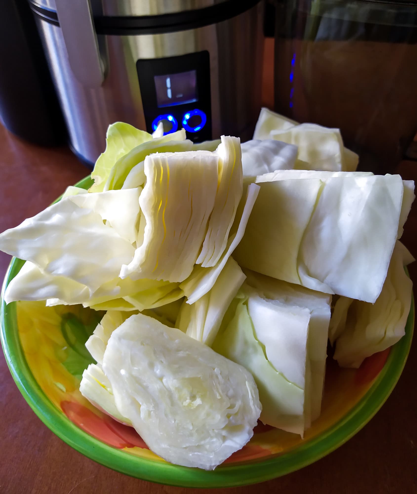 Капусту, включая небольшой кусок кочерыжки, нарезали кусками.