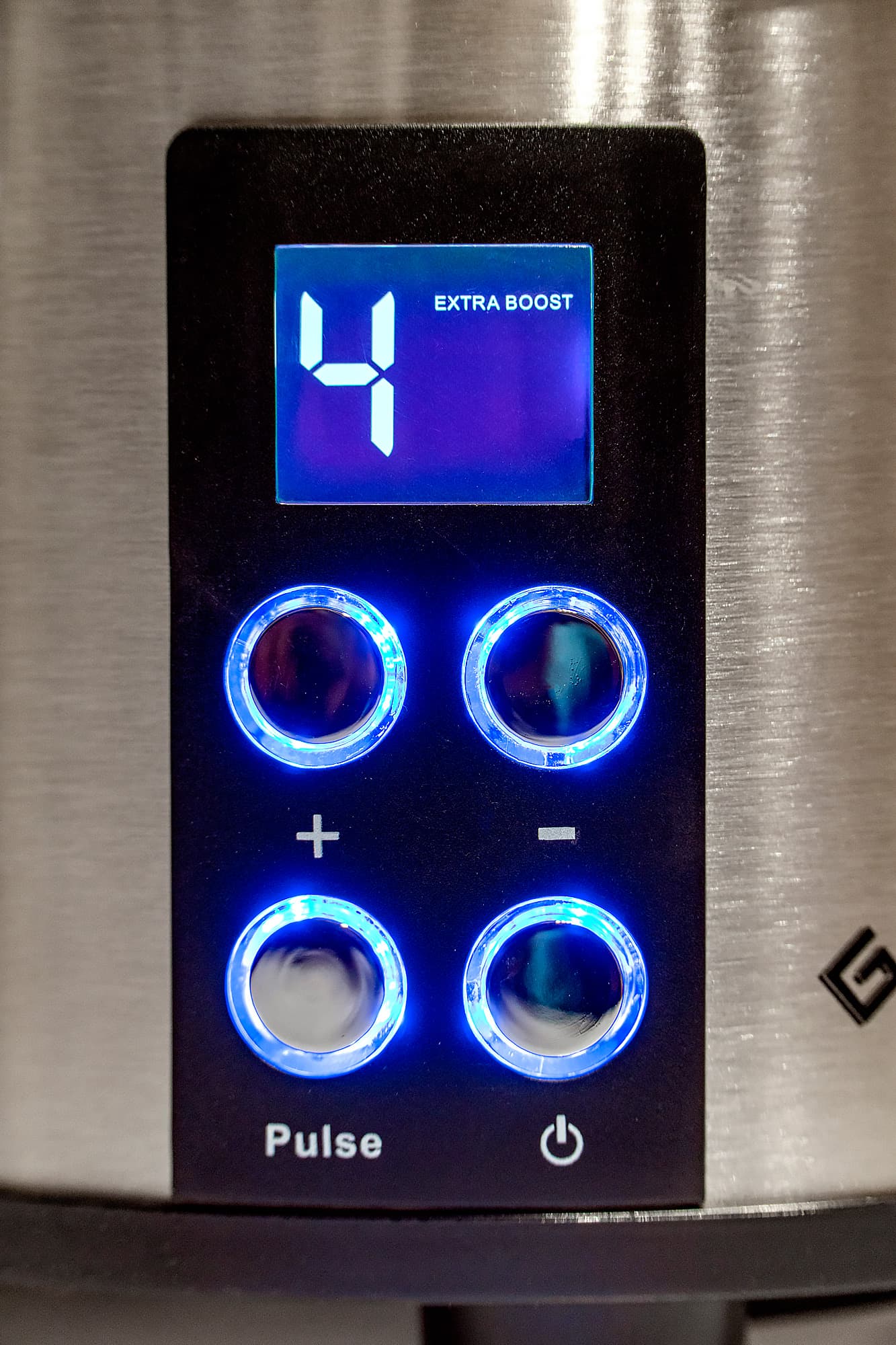 Панель управления состоит из четырех кнопок: «+» и «−» для установки скорости вращения, кнопки включения/выключения и импульсного режима.