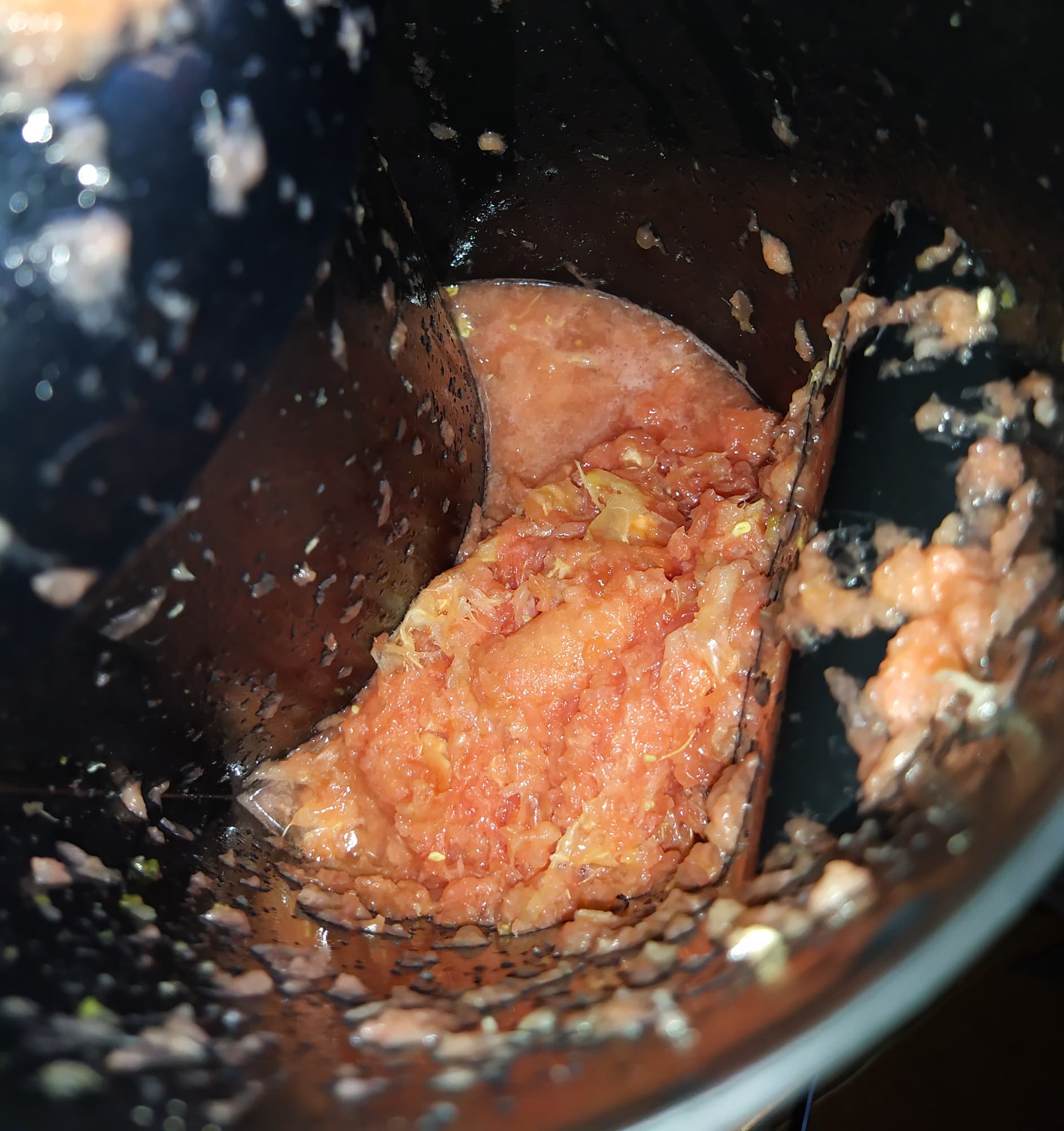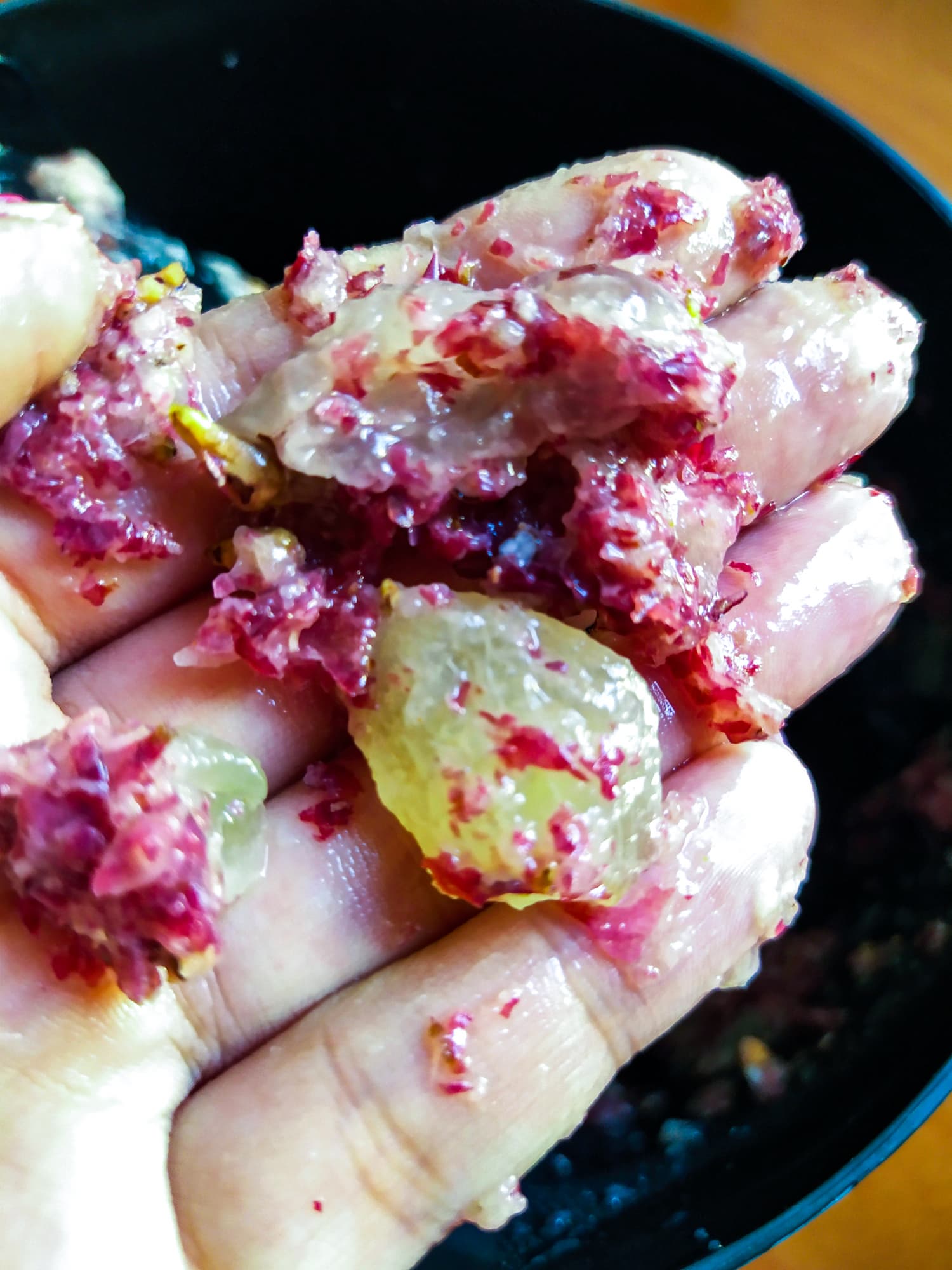 А вот жмых мокрый, и среди кусков шкурки и осколков косточек полно почти целых виноградин. Жаль, сока у нас могло быть больше, но он ушел в утиль.