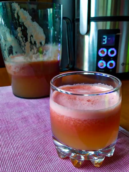 Выжимается сок очень быстро, даже на низких скоростях и даже из твердых продуктов, таких как картофель и свекла. С мягкими фруктами, такими как грейпфрут и виноград, соковыжималка справляется тоже неплохо, но могло быть и лучше: много сока уходит в жмых. Сок получается непрозрачный, но ощущаемых кусочков фруктов и овощей мы не обнаружили в нем ни разу. Рекомендуемое время работы — 1 минута, но даже при превышении этого максимума никаких проблем не возникало, соковыжималка не грелась, мотор работал в штатном режиме.