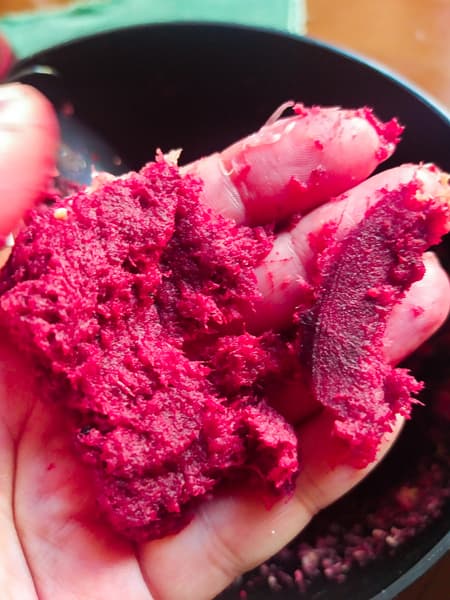 Жмых слегка влажный, в нем встречаются редкие кусочки свеклы и лимонных долек.