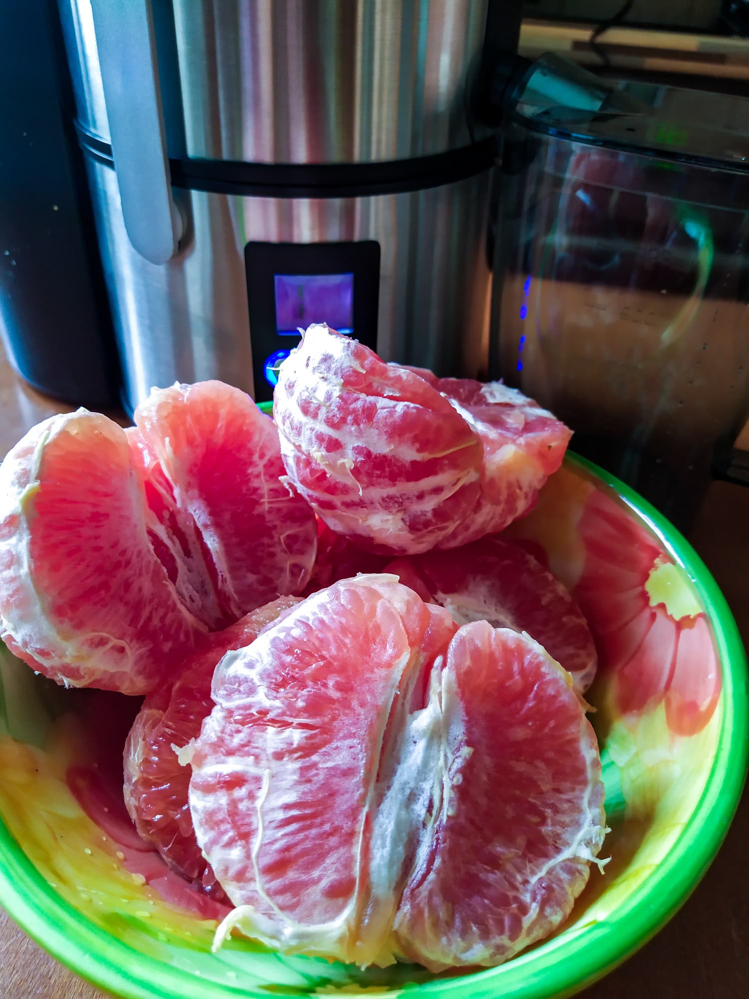 Очистили грейпфрут от кожуры и от белых пленок. Запустили соковыжималку на третьей скорости.