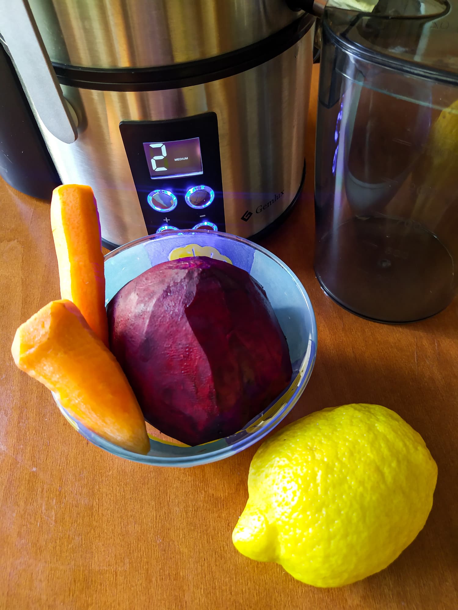 Взяли большую свеклу, две моркови и половину лимона (общий вес — 500 граммов). Свеклу порезали на четвертинки.