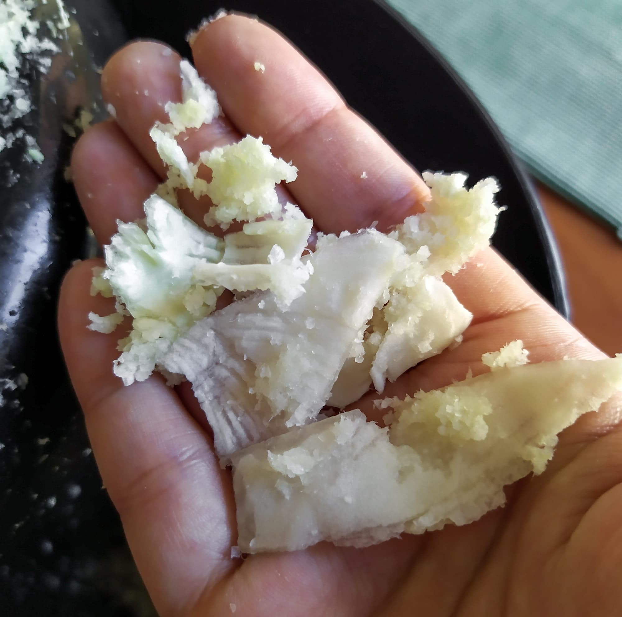 Жмых лишь слегка влажный, но в нем много кусков капустного листа.
