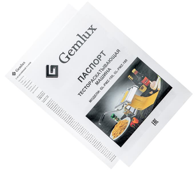 Gemlux GL-PMZ-180 изготовлена из хромированной стали. Конструкция представляет из себя три ролика (один для раскатки, два для нарезки), приводящиеся в движение ручкой. Расстояние между валиками и платформой, на которой стоит прибор, составляет 85 мм.