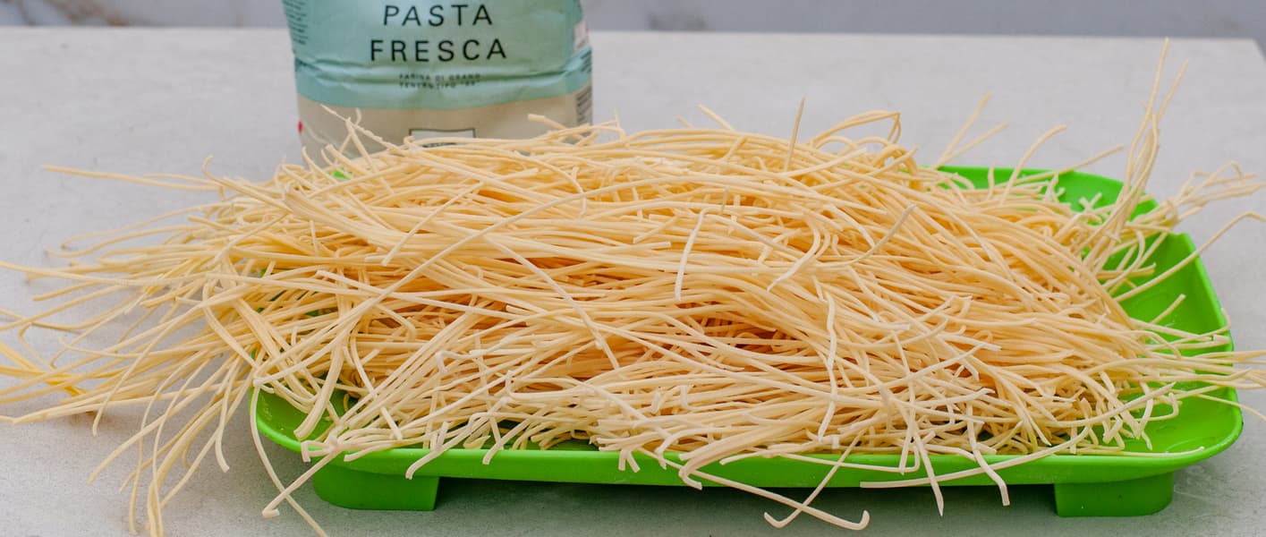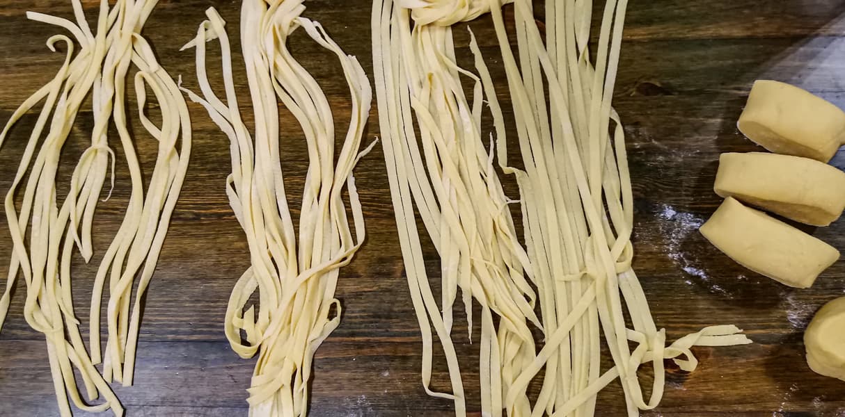 Для феттуччини (название происходит от fettuccia — ленточка) из твердой пшеницы мы взяли муку дурум помола «крупка», яйца и замесили тесто по рецепту Gemlux. Нарезали порционно, раскатали до толщины 0,9 мм (значение 2 на регуляторе), нарезали с помощью валиков для феттуччини.