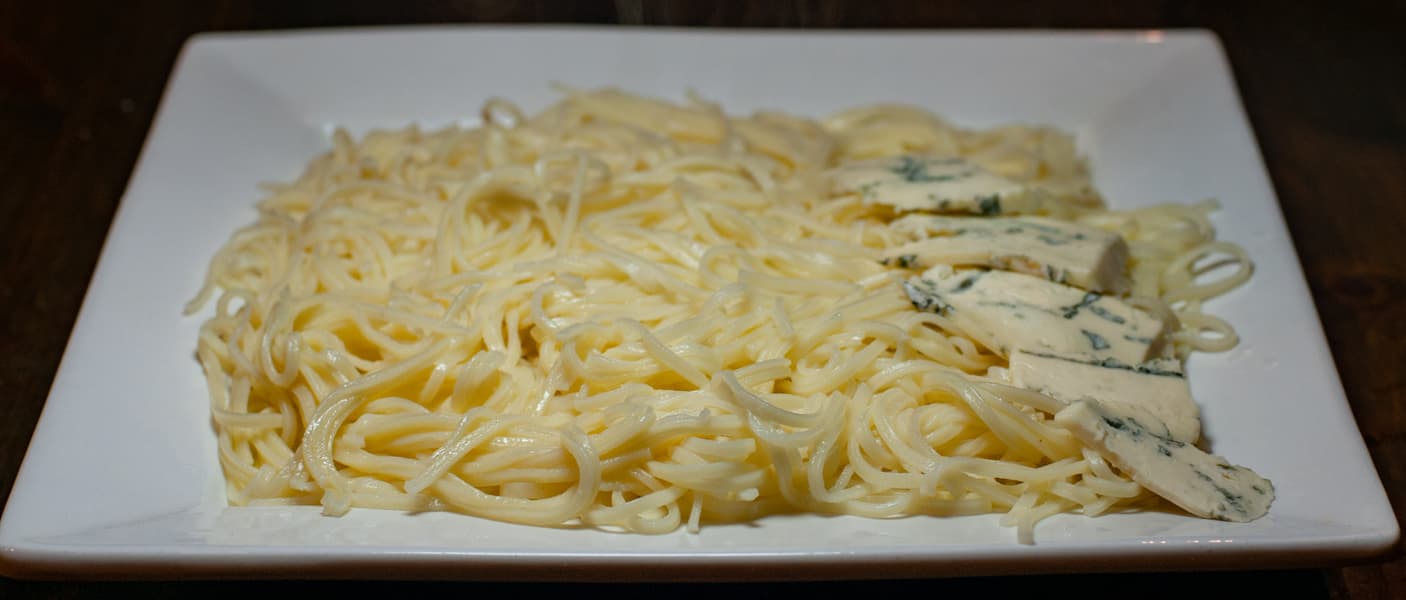 Через пару часов аккуратно сняли с сушилки, сварили в соленой воде, подали с сыром «Dorblu».