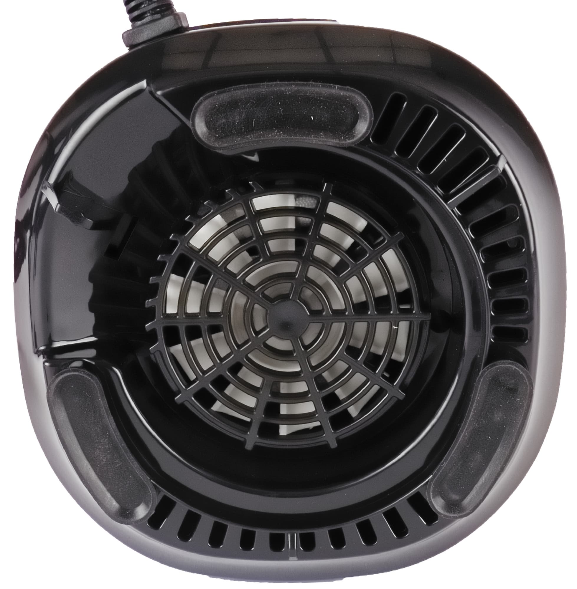 По центру дна корпуса находится белый вентилятор за черной решеткой, все из пластика. Три широкие ножки снабжены резиновыми присосками, чтобы прибор не скользил на рабочей поверхности.