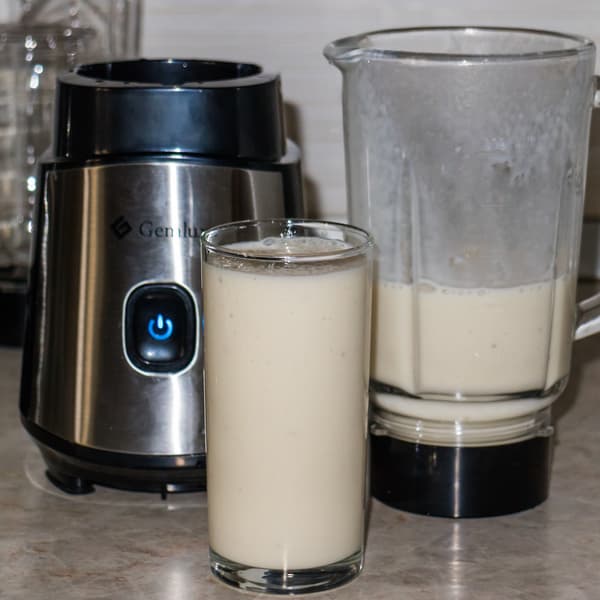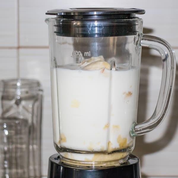 Банан очистили от кожуры и поломали на небольшие кусочки. Добавили к банану молоко и поставили кувшин на моторный блок.
