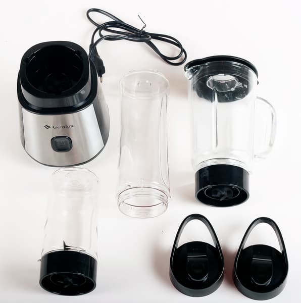 Персональный блендер Gemlux GL-PSB500PL укомплектован двумя дополнительными стаканами объемом 400 и 570 мл. Форма и исполнение стаканов абсолютно идентичны. Оба они изготовлены из тритана, необременительны по весу — 124 г и 150 г вместе с крышками. Крышки также одинаковы, оснащены отверстием для питья и ручкой.