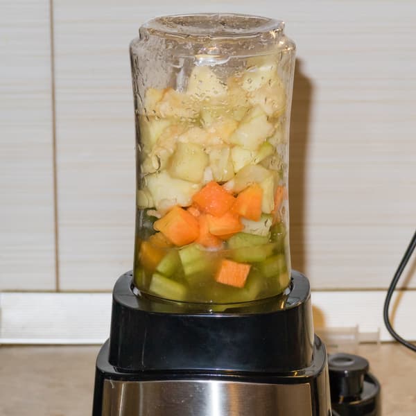 Сырье перед измельчением или блендированием нужно подготовить: удалить те части, которые могут повредить ножи блендера, например, крупные косточки из фруктов, или испортить вкус готового напитка (кожура от киви или манго). Продукты нужно нарезать на кусочки. В паспорте есть рекомендация перерабатывать в блендере только жидкости и мягкие фрукты и овощи. Тем не менее, во время тестирования мы измельчали относительно жесткие яблоки и морковь. Блендер успешно справляется с этой задачей при одном условии — продукты такого типа следует нарезать мелко. В противном случае они могут не измельчиться, а застрять на лезвиях ножевого блока.