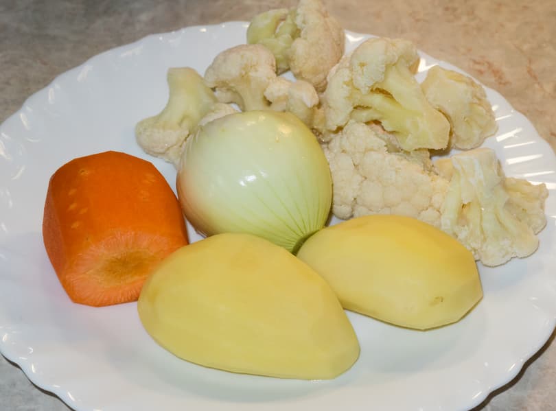 Картофель, лук, морковку и цветную капусту отварили в подсоленной воде.