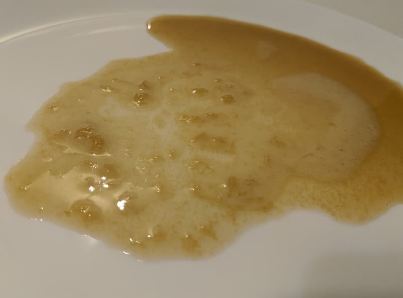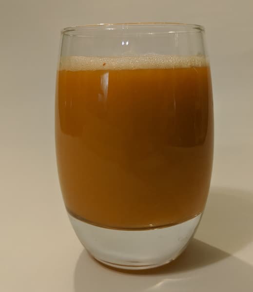 Он получился яркого насыщенного цвета, но в нем оказалось много совсем уж мелкой мякоти, которую мы откинули на сито. Можно просто подождать, пока она осядет на дно емкости, или пить сок с мякотью — это полезно. Стакан сока в 200 граммов по нашим измерениям содержит 173 грамма чистого сока и 16-17 граммов практически сухого жмыха.