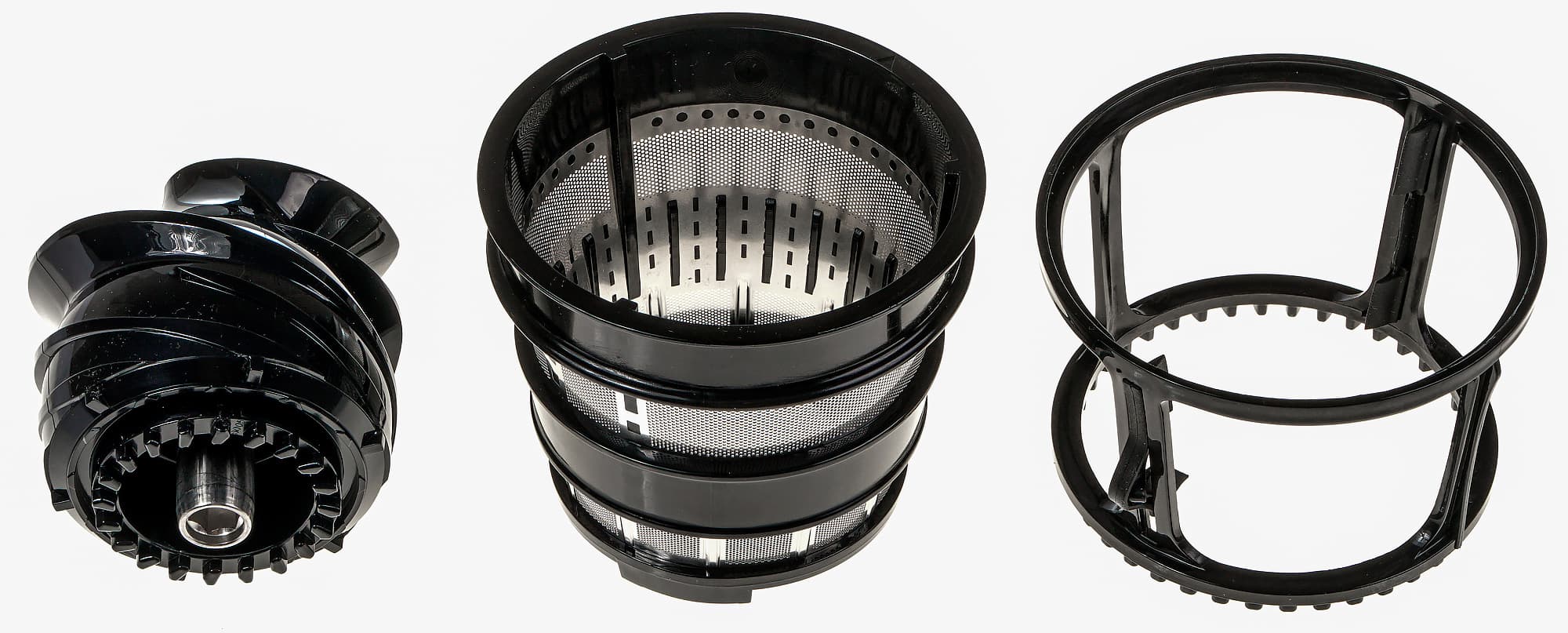 Фильтр в этой соковыжималке один, он представляет собой стальной перфорированный перевернутый усеченный конус, который опирается на держатель из черного пластика. Сверху у фильтра более крупные отверстия, снизу — более мелкие. Фильтр вставляется в чашу, уже закрепленную на моторном блоке. Для облегчения его позиционирования служат две риски — на самом фильтре и на выступе моторного блока.