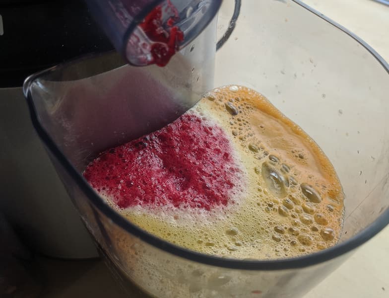 Через 10 секунд практически одновременно из обоих носиков началось поступление в чаши сока и жмыха соответственно. Полностью отжать весь сок до капли у соковыжималки не получилось, жмых оказался достаточно сочным для дальнейшего использования — например, в морковных котлетах. Однако выход готового продукта нас порадовал: из килограмма моркови вышло 563 грамма готового сока.