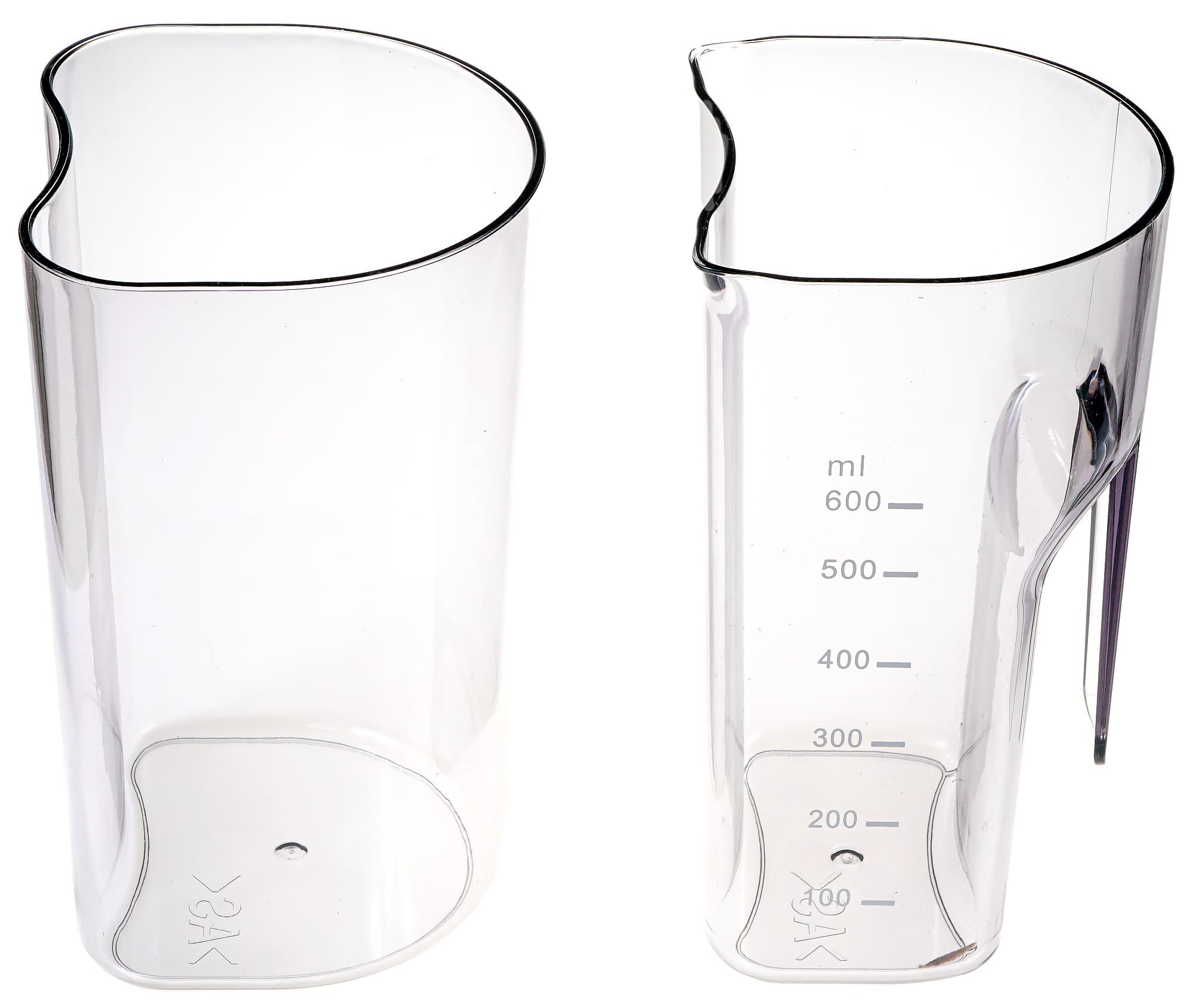 На выпуклой стороне стакана есть удобная ручка, за которую его можно извлекать из-под носика и быстро сливать сок. На бок стакана нанесена шкала объема, которая показывает, сколько сока уже выжато.