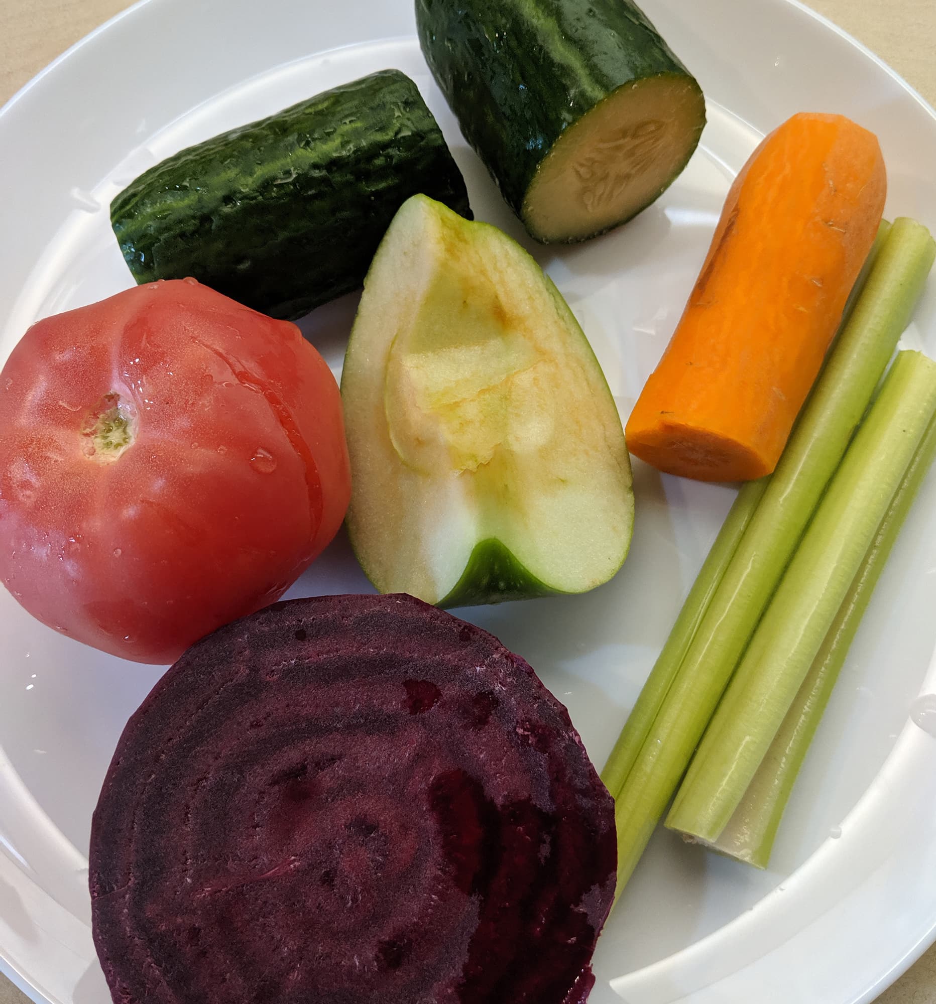 У нас было несколько достаточно сочных помидоров, остатки моркови от предыдущего теста, три стебля сельдерея, половина очищенной свеклы, несколько кусков длинноплодного огурца и половина зеленого яблока. Хорошо, что не осталось капусты!
