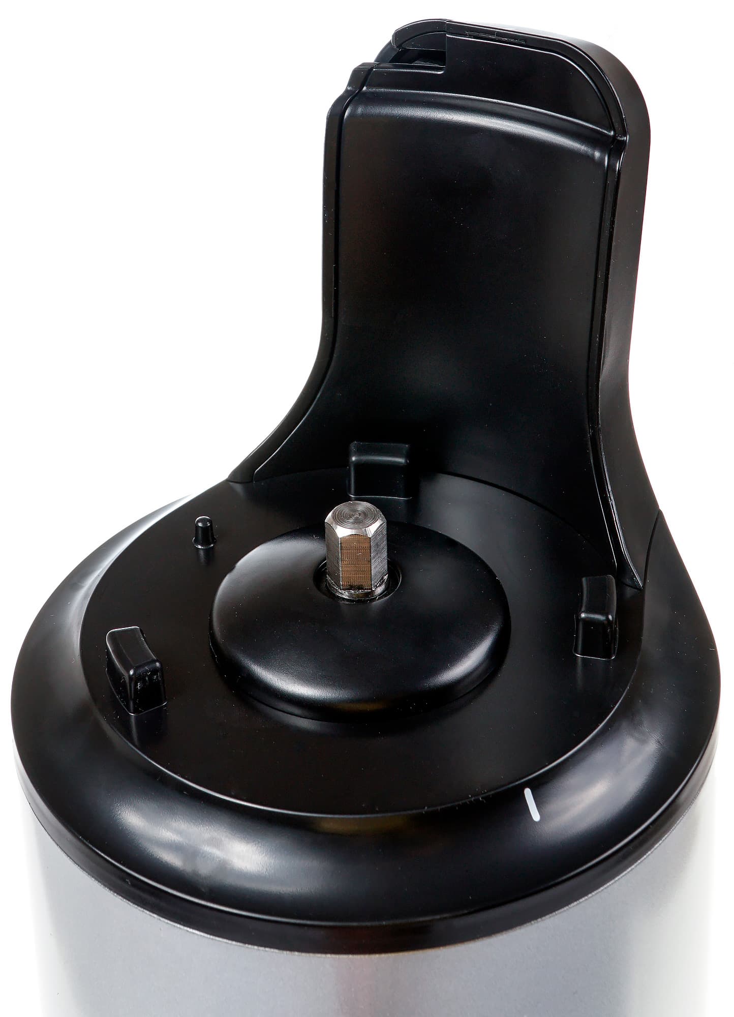 Из верхней части моторного блока выступает стальной шестигранный вал, приводящий в движение шнек соковыжималки. На верхней части блока расположены три небольших выступа для правильного позиционирования чаши устройства и высокий выступ с защелкой для фиксации крышки чаши.