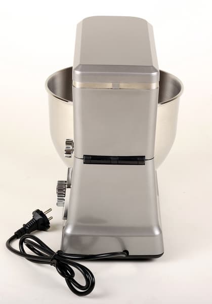 Корпус нашего нового планетарного миксера весьма компактен и не занимает много места на столе. Он кажется еще меньше и аккуратнее из-за сочетания четких геометрически выверенных очертаний, скругленных углов и приятного металлического цвета. Его дизайн вполне уместен в модной кухне стиля хай-тек, да и в других стилях тоже не будет сильно выбиваться из общей гаммы. Вес его не слишком велик, носить с места на место несложно, даже в полном сборе.