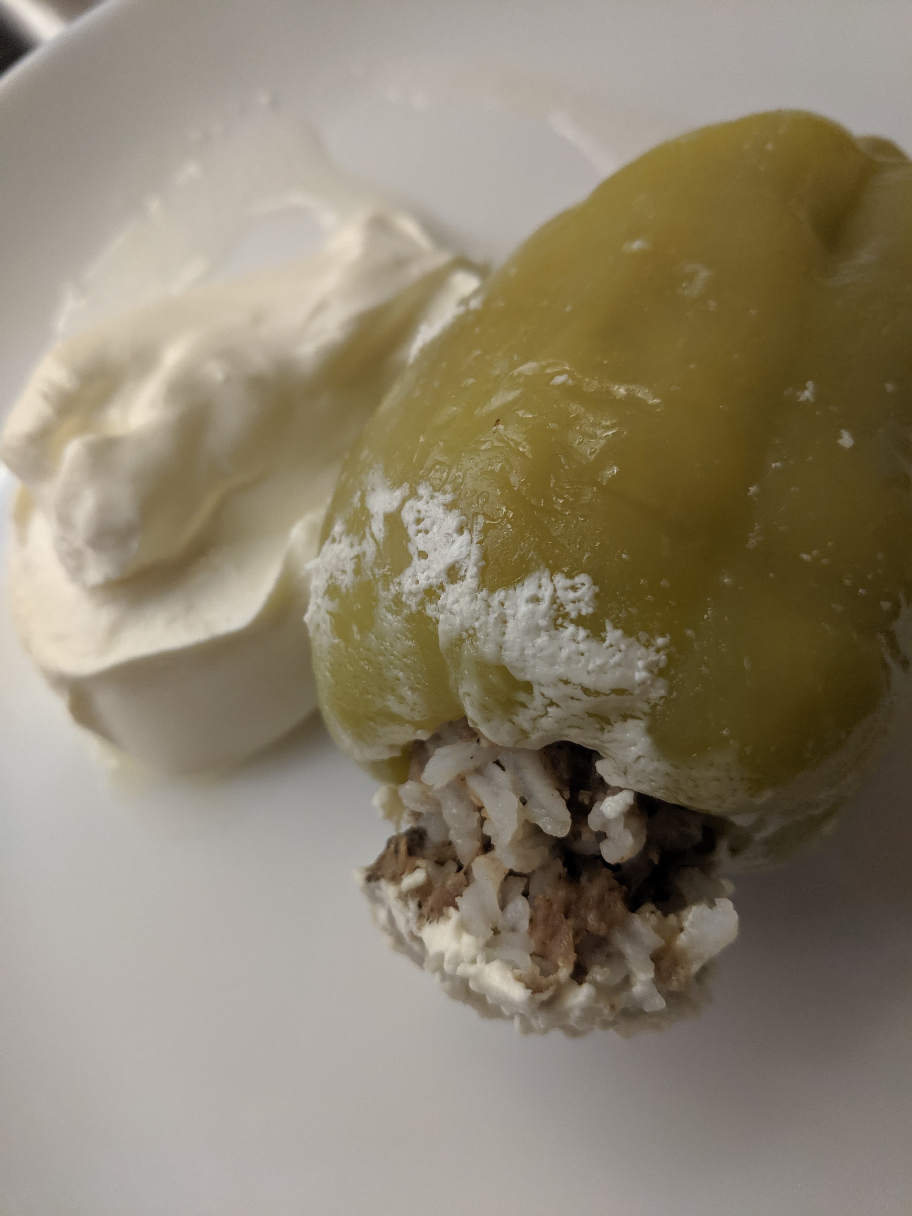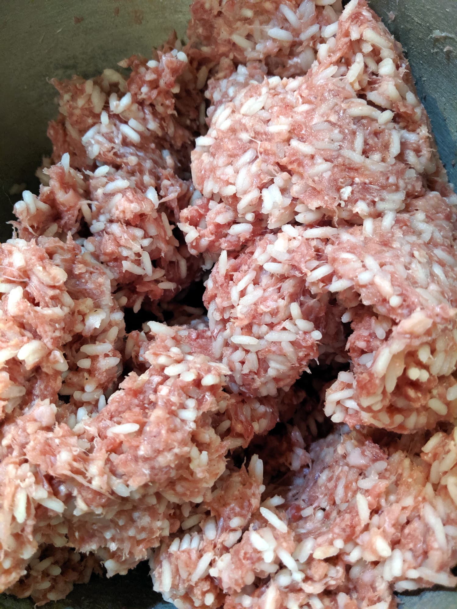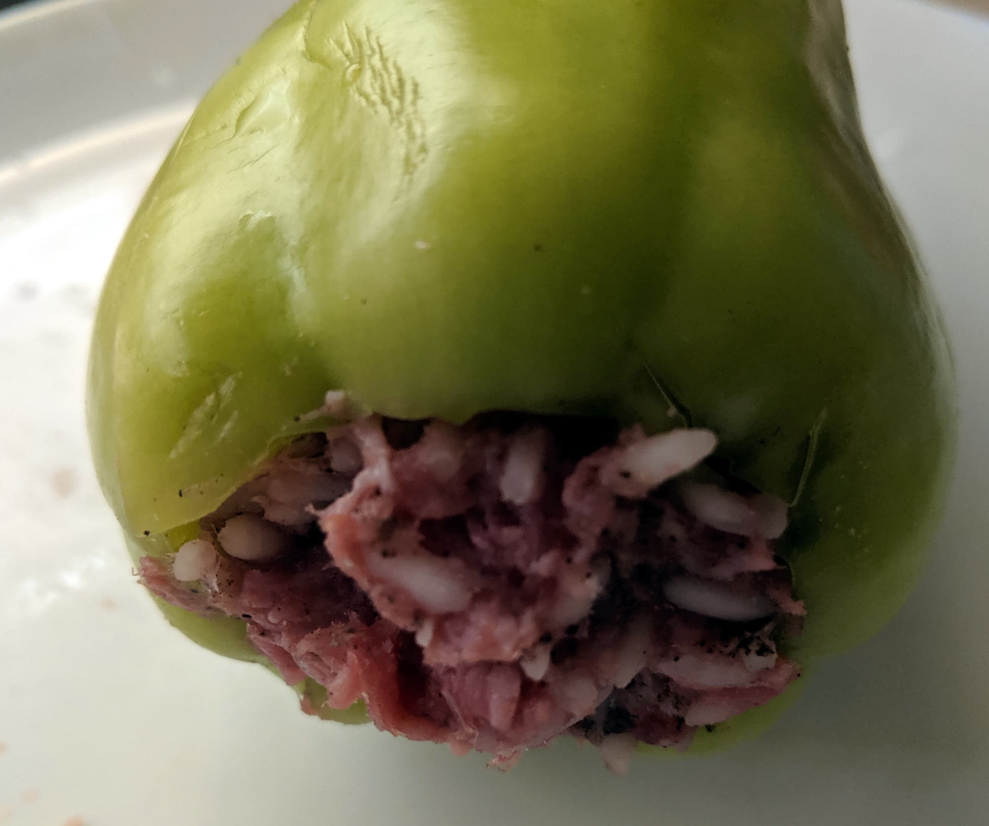 После того, как соль и специи были смешаны с фаршем, мы добавили в миску около 400 граммов риса, сваренного до полуготовности. Еще три минуты на второй скорости — и начинка готова. Рис сохранил свою целостность, равномерно распределился по начинке, которая стала достаточно плотной, чтобы не рассыпаться в перцах, но и достаточно мягкой, чтобы равномерно в них протушиться.