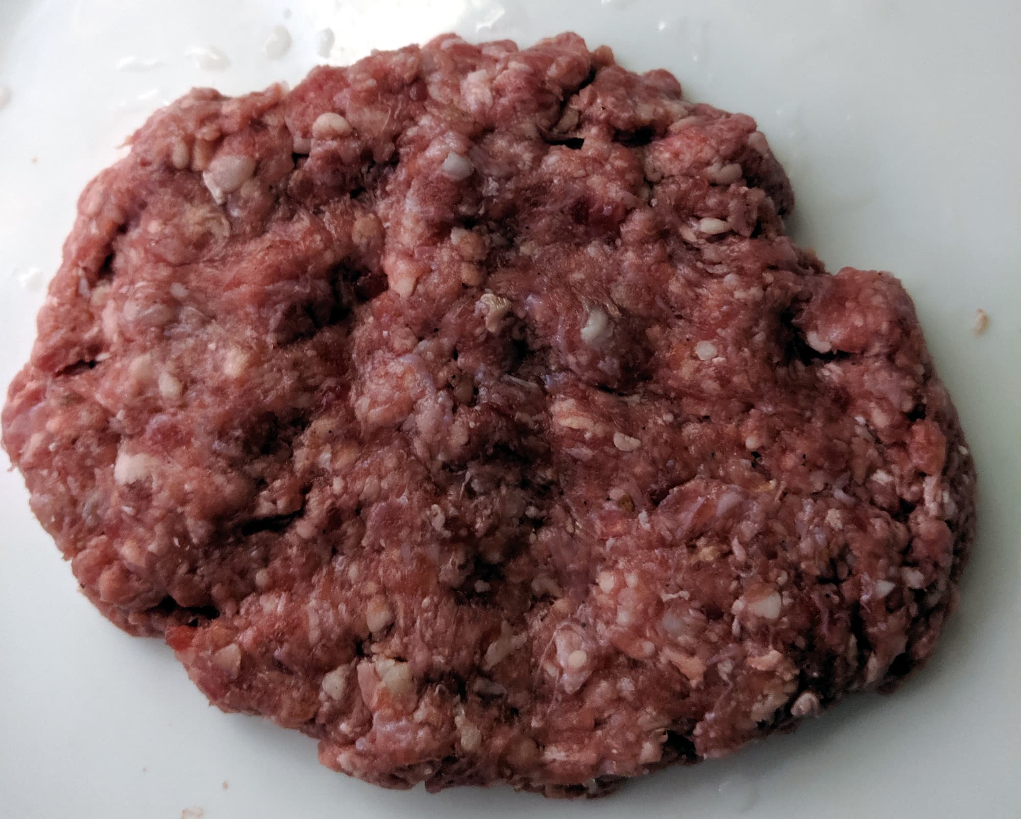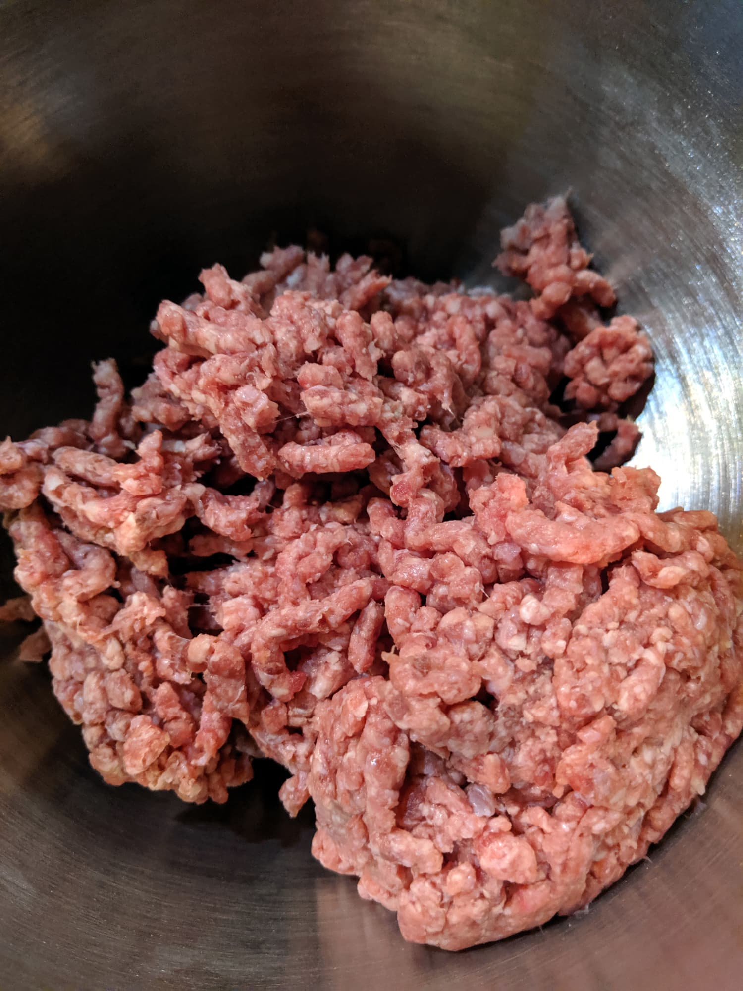 Через пять с половиной минут мы сочли фарш в достаточной степени готовым: структура была однородная, пряности в фарше распределились равномерно. Для достижения нужной плотности мы несколько раз с силой кинули хорошо замешенный фарш в миску, чтобы «отбить» его.