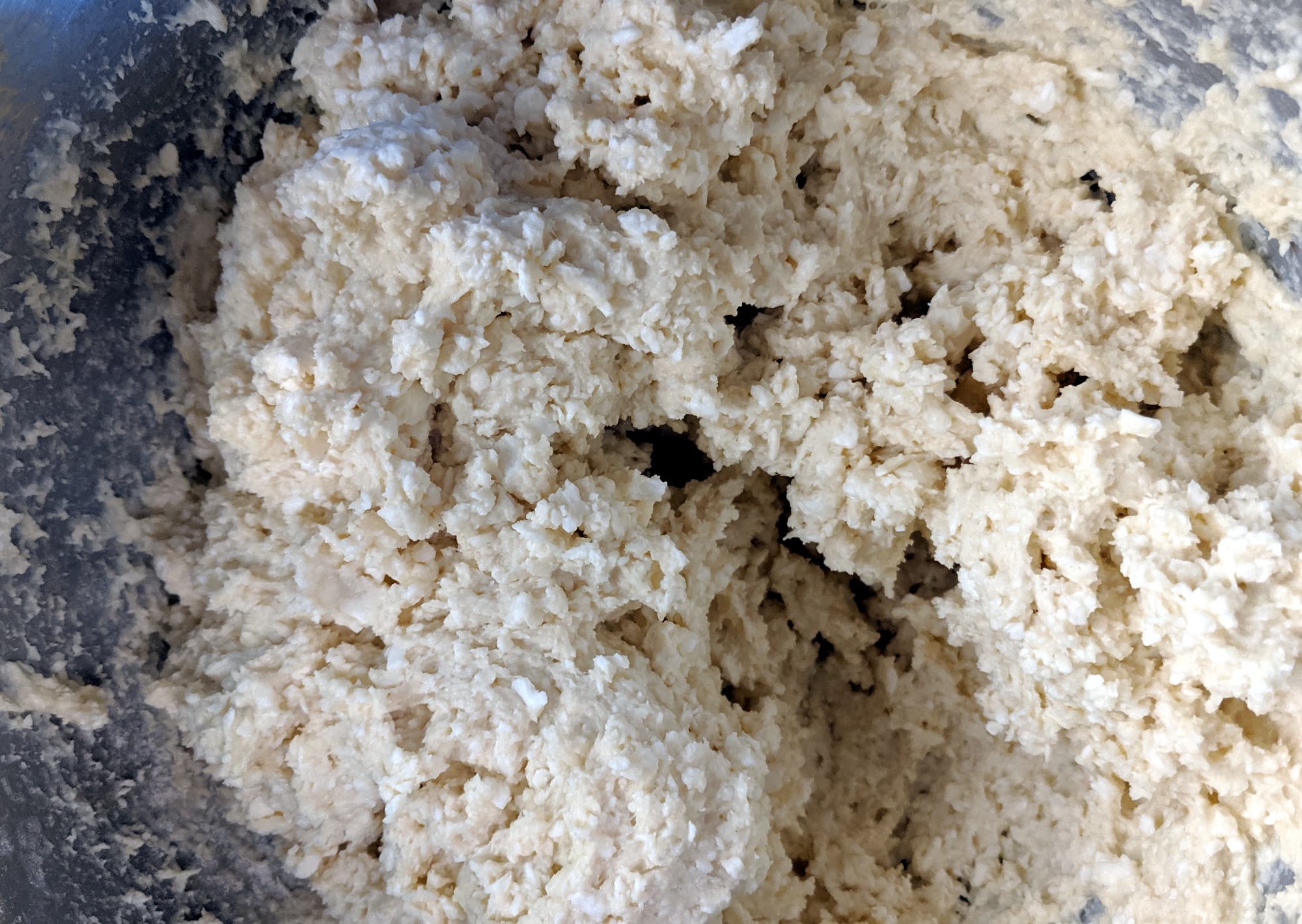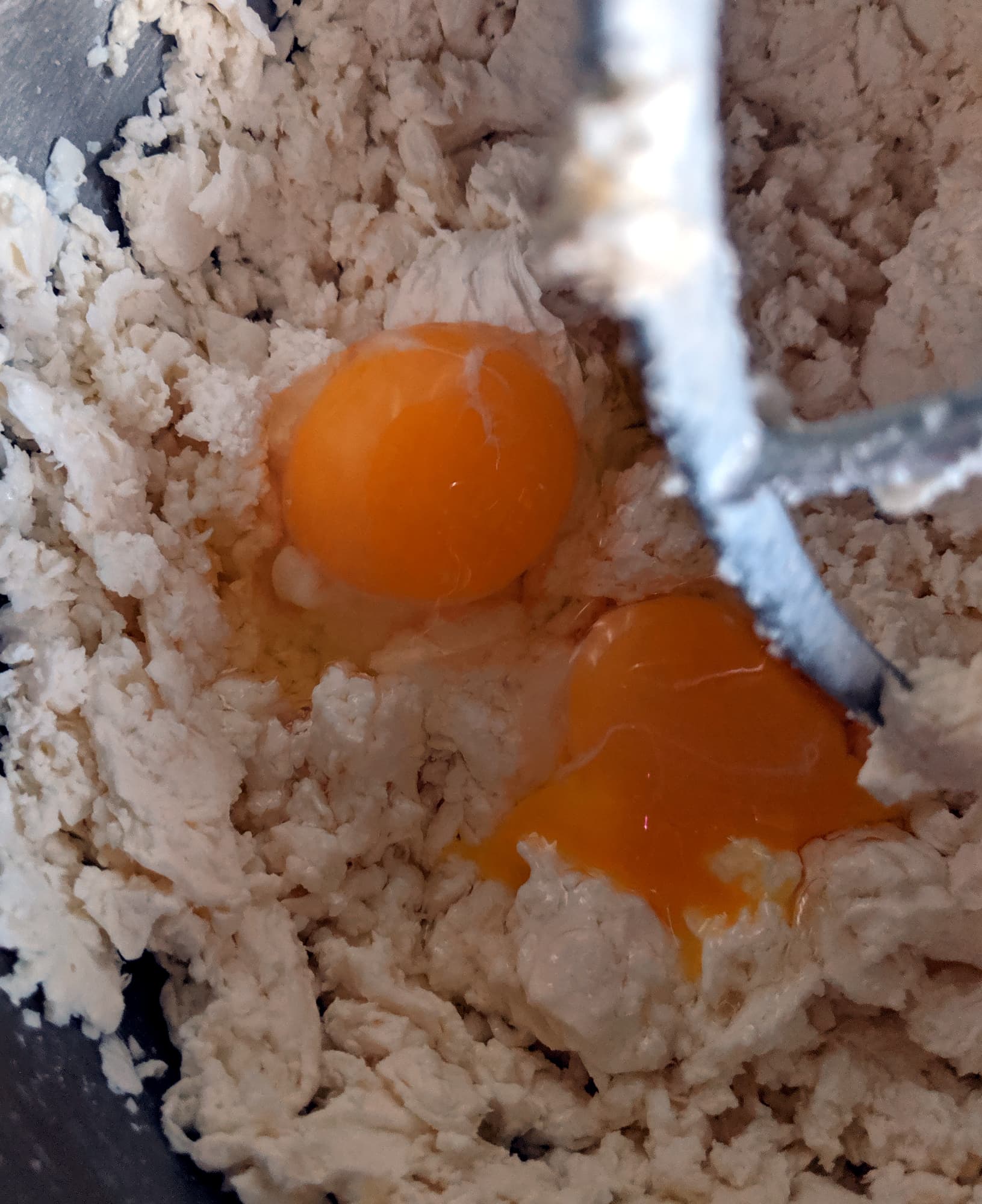Сначала плотный творог превратился в относительно однородную (без крупных кусков) массу. После добавления яиц тесто стало более гладким и на вид достаточно легким, так что мы добавили муки, не меняя насадку. Некоторое время вымешивание теста шло успешно, но затем, после очередной порции муки, начало налипать на мешалку так, что она уже не мешала, а только крутила на себе ком теста.