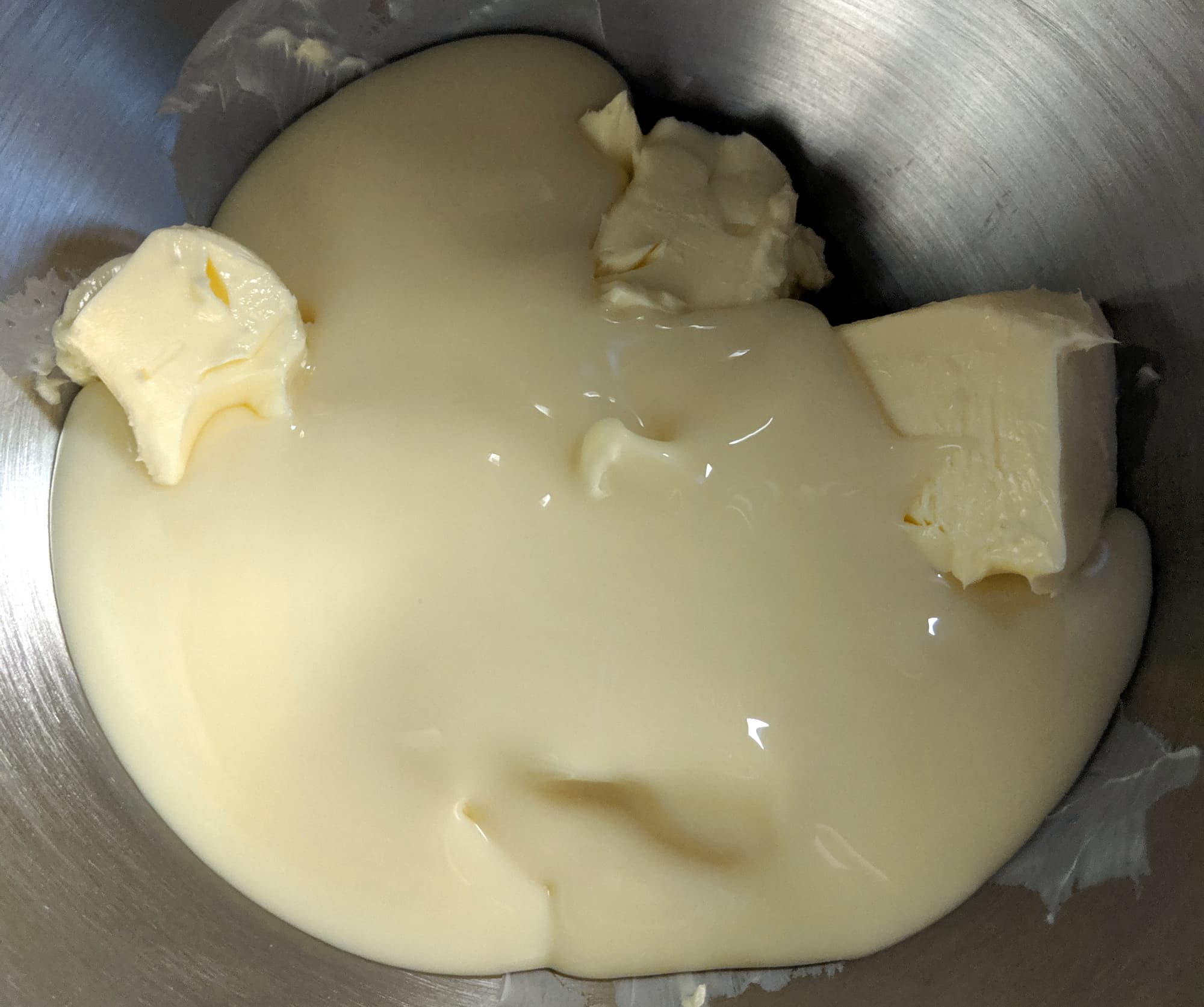 Мы взяли стандартную пачку сливочного масла (180 граммов) и стандартную упаковку сгущенки (360 граммов). И то, и другое оставили при комнатной температуре до тех пор, пока масло не стало мягким. После чего масло в чаше разделили на несколько частей, добавили сгущенное молоко и начали взбивать венчиком со второй скорости. Через две минуты масло разошлось уже достаточно, чтобы скорость можно было плавно повысить до пятой и взбивать дальше именно на ней. Результатом стал гладкий и сладкий крем.