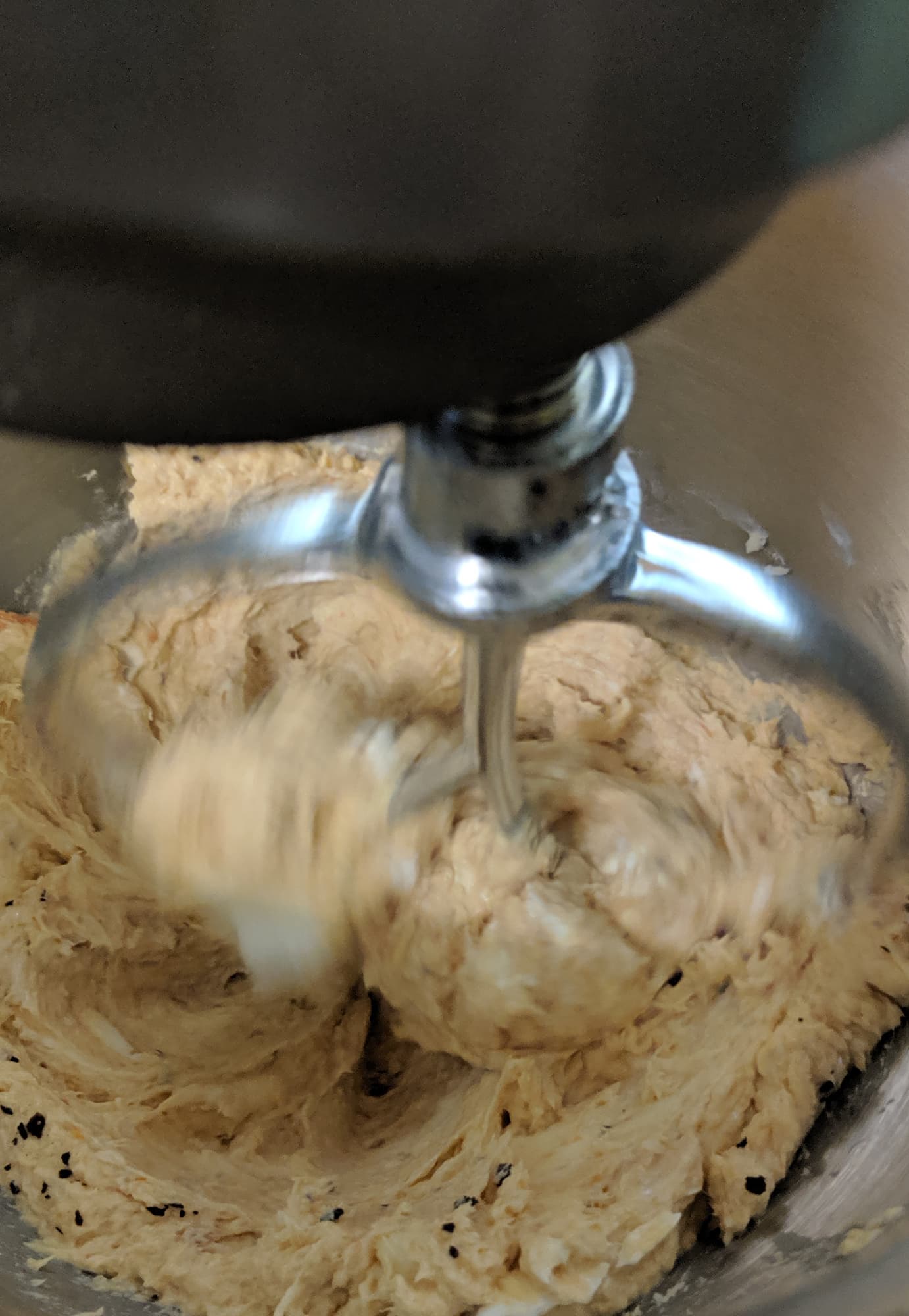 Перемешивание сухих и полусухих компонентов планетарный миксер выполнил с блеском и практически играючи. А вот добавление воды в тесто заставило его работать на пределе сил, горько жалуясь на жизнь. Защитная крышка на крюке болталась и стучала. Так наш миксер проработал 6 минут без остановки и в конце концов выдал нам однородное тесто, которое, впрочем, нам пришлось немного довести до правильной консистенции руками.