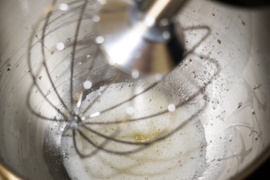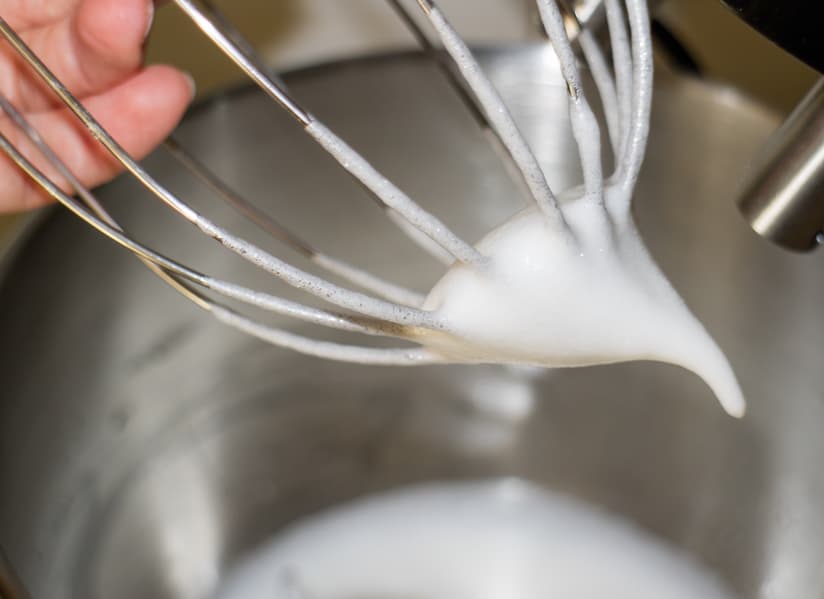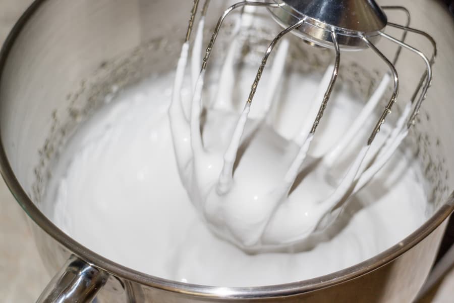 Работали на шестой скорости, мощность прибора колебалась около 150 Вт. На 12 минуте белки побелели и начали увеличиваться в объеме. Через 15 минут с начала работы мы получили желаемое — белки взбились до стадии твердых пиков.