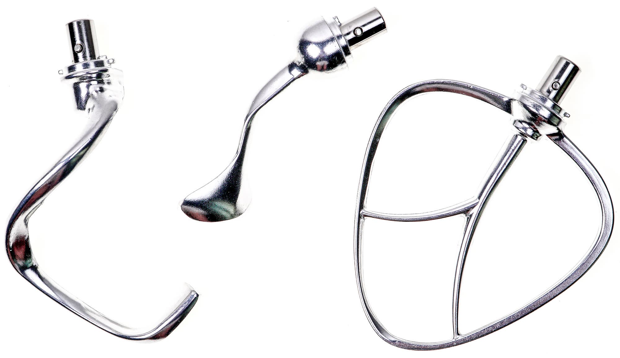 Насадка битер и крюки для теста сделаны из силумина. Один крюк стандартной формы, другой — укороченный с широкой лопастью в нижней части.