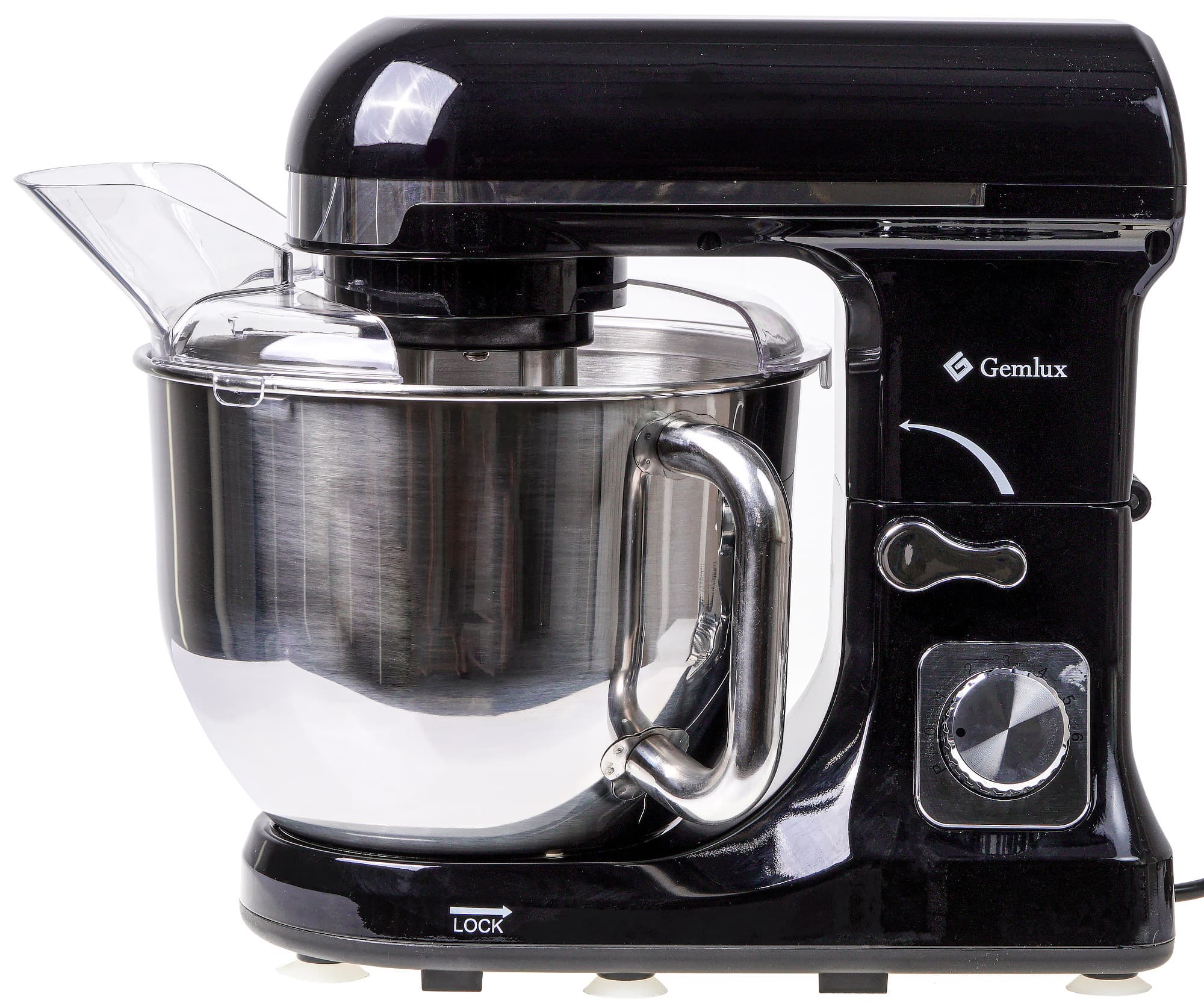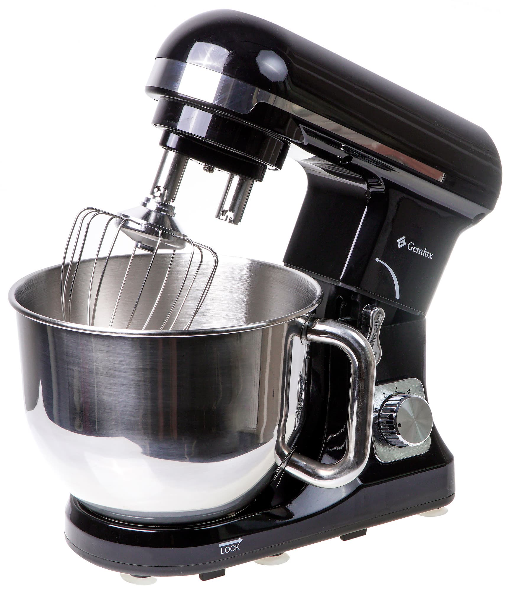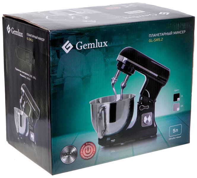 У планетарного миксера Gemlux GL-SM5.2 есть две особенности, которые привлекают к нему особенное внимание: заявленная мощность в 1000 Вт и двойной крюк для замеса плотного теста. Также отметим металлическую чашу объемом в пять литров и насадки, изготовленные полностью из металла.