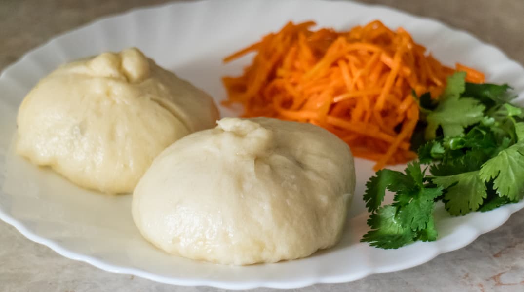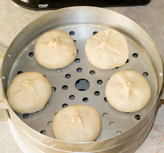 Готовые пянсе выложили в мантоварку, уровни которой обильно смазали растительным маслом.