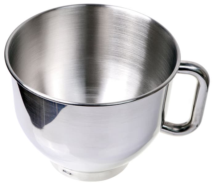 В комплект входит чаша объемом пять литров, изготовленная из полированной нержавеющей стали. У чаши есть ручка, что признано нами крайне удачным решением, несмотря на увеличивающиеся из-за этого габариты прибора. Размер дежи возрастает на 5 см, а удобство пользования ею повышается многократно. Форма, привычная для планетарных миксеров — цилиндрические стенки, переходящие в сферу. На дне имеется конусообразный выступ — обычно такая форма обеспечивает возможность успешной переработки даже малых объемов продуктов.