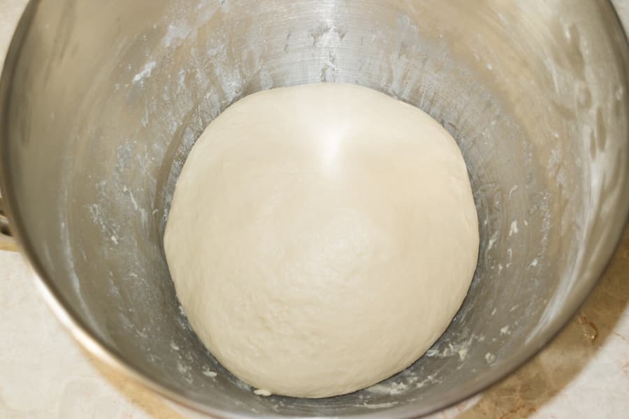 Легонько размешали одно яйцо в теплой воде, затем вылили в чашу миксера. Туда же покрошили дрожжи и перемешали их до растворения. Всыпали соль и сахар, добавили масло и 500 г муки. Установили оба крюка и запустили миксер на второй скорости. Через две минуты сформовался комок теста. Потрогали его, оценили как недостаточно плотный и всыпали еще пару ложек муки. Уменьшили скорость до первой и работали еще пять минут.